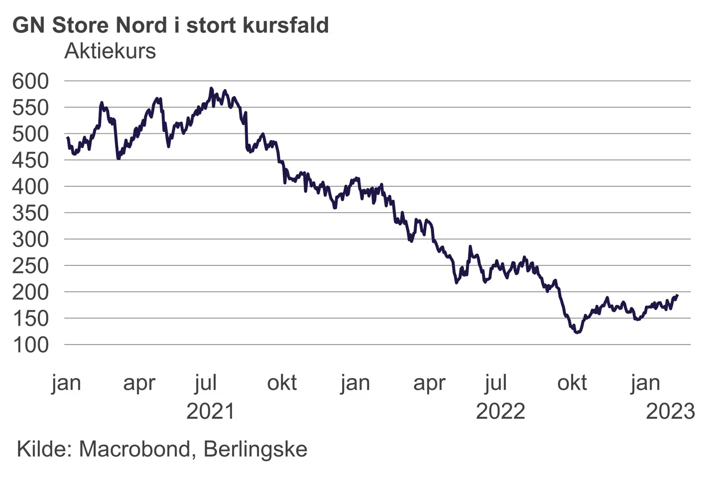 Aktien dykker torsdag 14 procent til en kurs på 169 kroner, hvilket gør den til dagens suverænt dårligste aktie i det danske eliteindeks, C25. Kurslussingen kommer, efter at høreapparatvirksomheden sent onsdag meldte ud, at den har planer om at rejse syv milliarder kroner i ny kapital på grund af »det nuværende makroøkonomiske miljø og GNs gældsbyrde«.