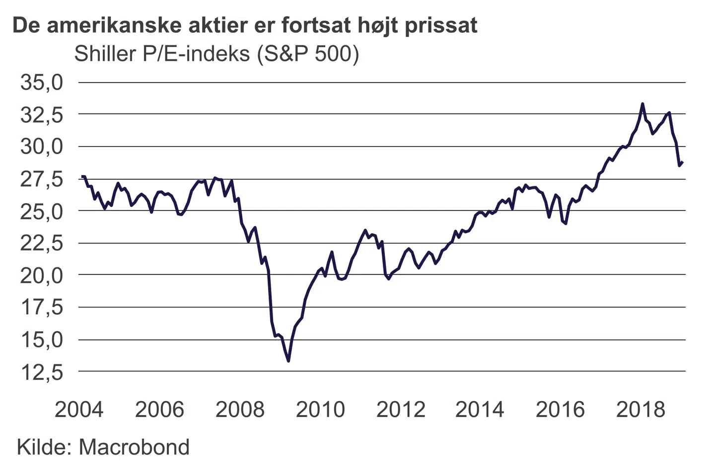 Med udgangspunkt i en model, som den amerikanske nobelprismodtager og professor Robert J. Shiller har udviklet, er aktieværdien målt i forhold til den gennemsnitlige indtjening i virksomhederne de seneste ti år – det såkaldte Shillers P/E-tal – i øjeblikket på 29 for de amerikanske selskaber. Det et lille fald fra den seneste top på 33, der blev sat i september, men stadig lidt over niveauet fra lige før finanskrisen. Med prisen på aktier spændt så godt op skal der få skvulp til, før investorerne igen bliver nervøse og sender aktierne ned.
