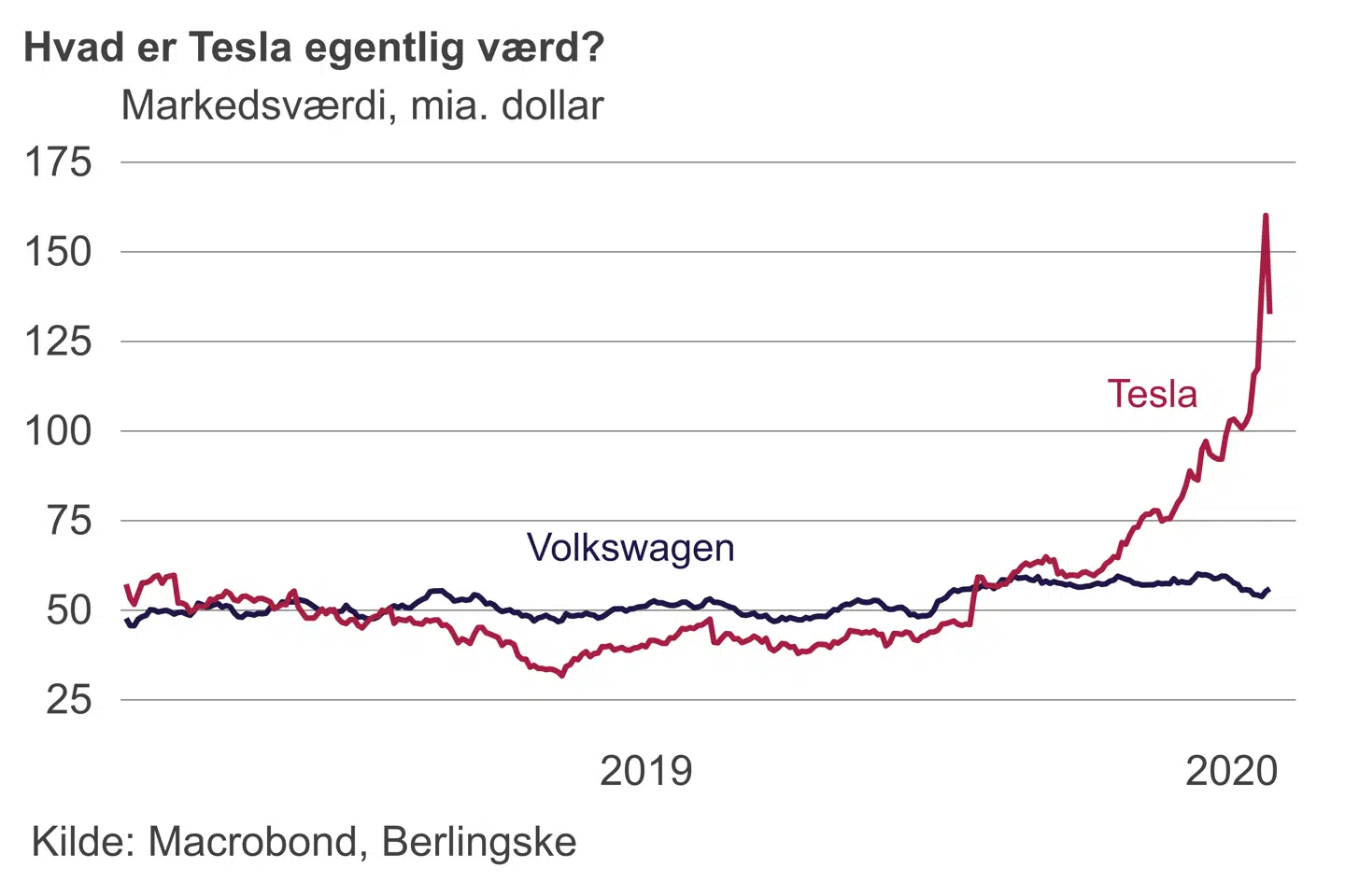 Efter en fænomenal optur den seneste uge fik Tesla-aktien klø onsdag og blev banket 17 procent tilbage – aktiens største fald siden 2013. Dermed fik Elon Musks elbilsvirksomhed barberet 27 milliarder dollar (cirka 183 milliarder kroner) af sin markedsværdi på en enkelt dag. Trods det store dyk er Tesla stadig verdens næststørste bilproducent mål på markedsværdi. Efter Toyota men foran mastodonter som Volkswagen og General Motors.