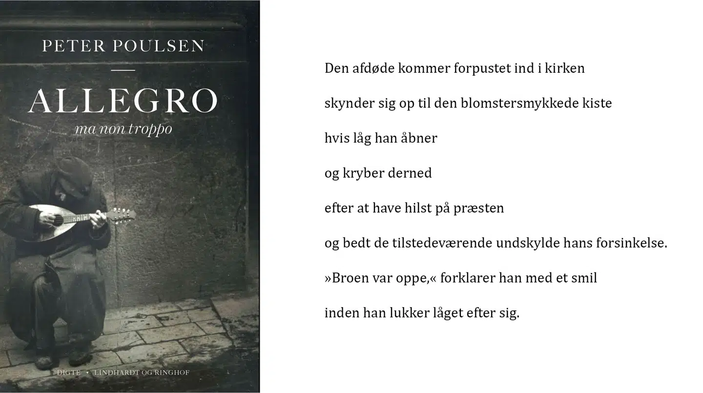 Vist er det ikke nogen munter historie, seniorpoeten Peter Poulsens digte har at fortælle, men at han er en af den danske lyriks store humorister, bekræfter »Allegro ma non troppo« overbevisende.