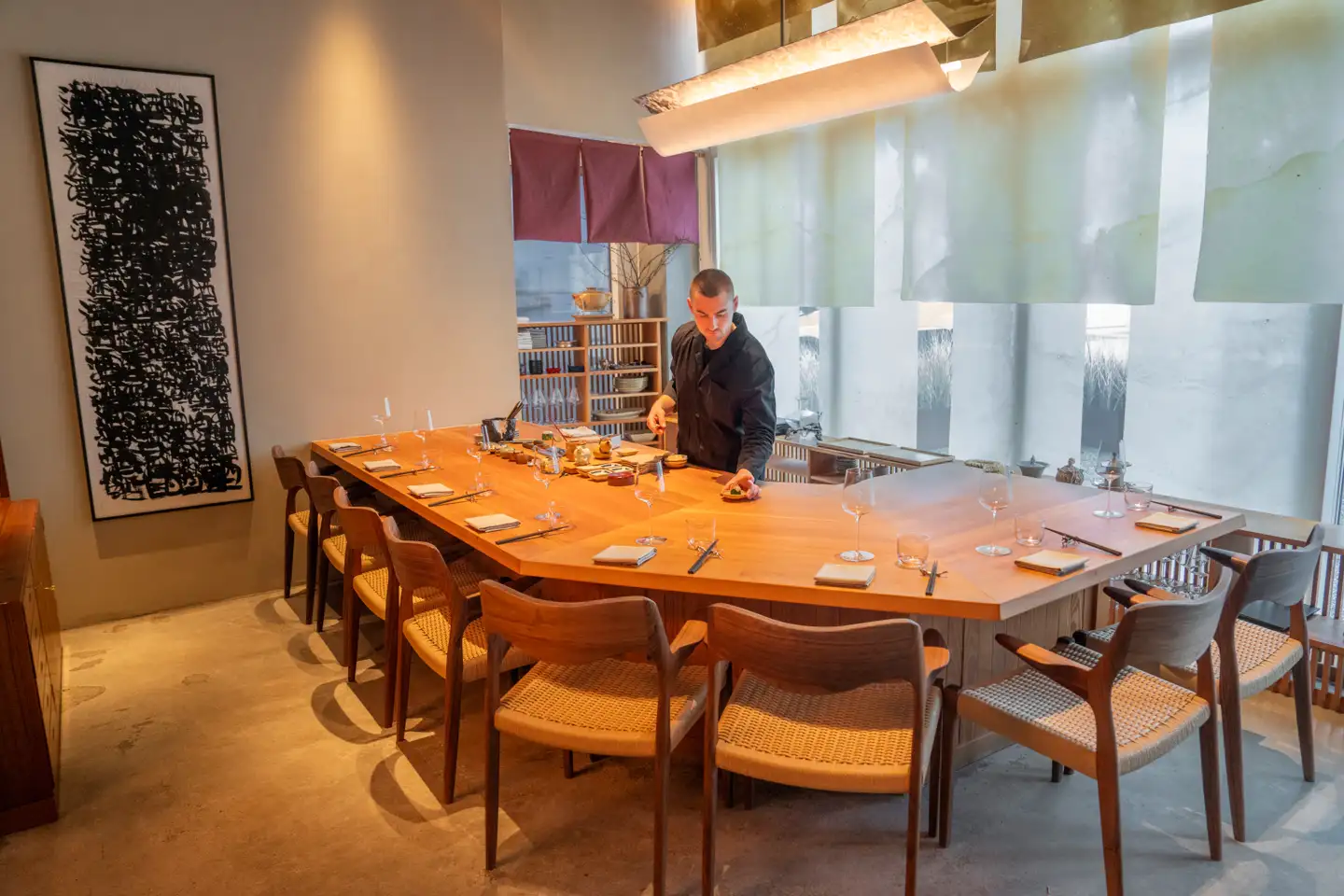 Køkkenets stil er et raffineret møde mellem fransk og japansk gastronomi, og man spiser ved Anabas gamle, komfortable spisedisk i lyst træ med plads til blot otte gæster. Det er ren klasse.