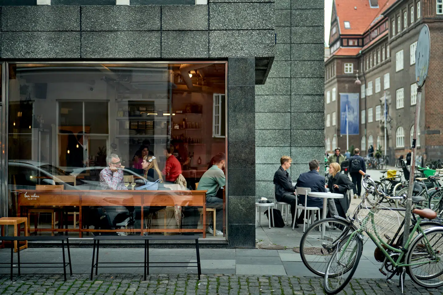 Bar Vitrine er med til at gøre København til et bedre sted. Sådan lød anmeldelsen i Berlingske, da stedet åbnede. Nu er baren kåret til Byens Bedste. Designet er minimalistisk og lækkert, og så kan man i den grad holde øje med byens puls gennem de store glasvinduer. Maden er indisk inspireret, og naturvinene dominerer. Man kan ikke bestille bord, så man må komme i god tid, og man kan jo altid tage et glas, mens man venter.