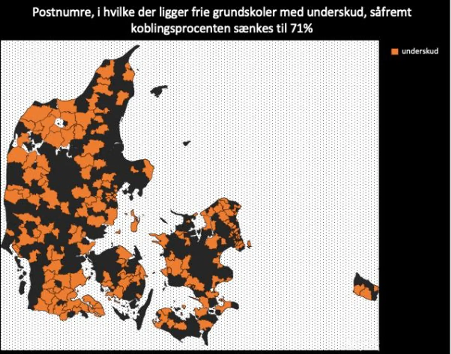 Friskoleforeningen har lavet beregninger baseret på tal fra 2017, hvorefter de har indregnet regeringens besparelser i friskolernes økonomi og fordelt resultatet udover landets postnumre på to kort, som ganske tydeligt viser, hvor i landet besparelserne vil ramme hårdest. Selvom Socialdemokratiet i valgkampen lancerede et udspil mod centralisering, »Nærheden tilbage«, vil resultatet betyde, at flere børn mister den nærmeste skole.