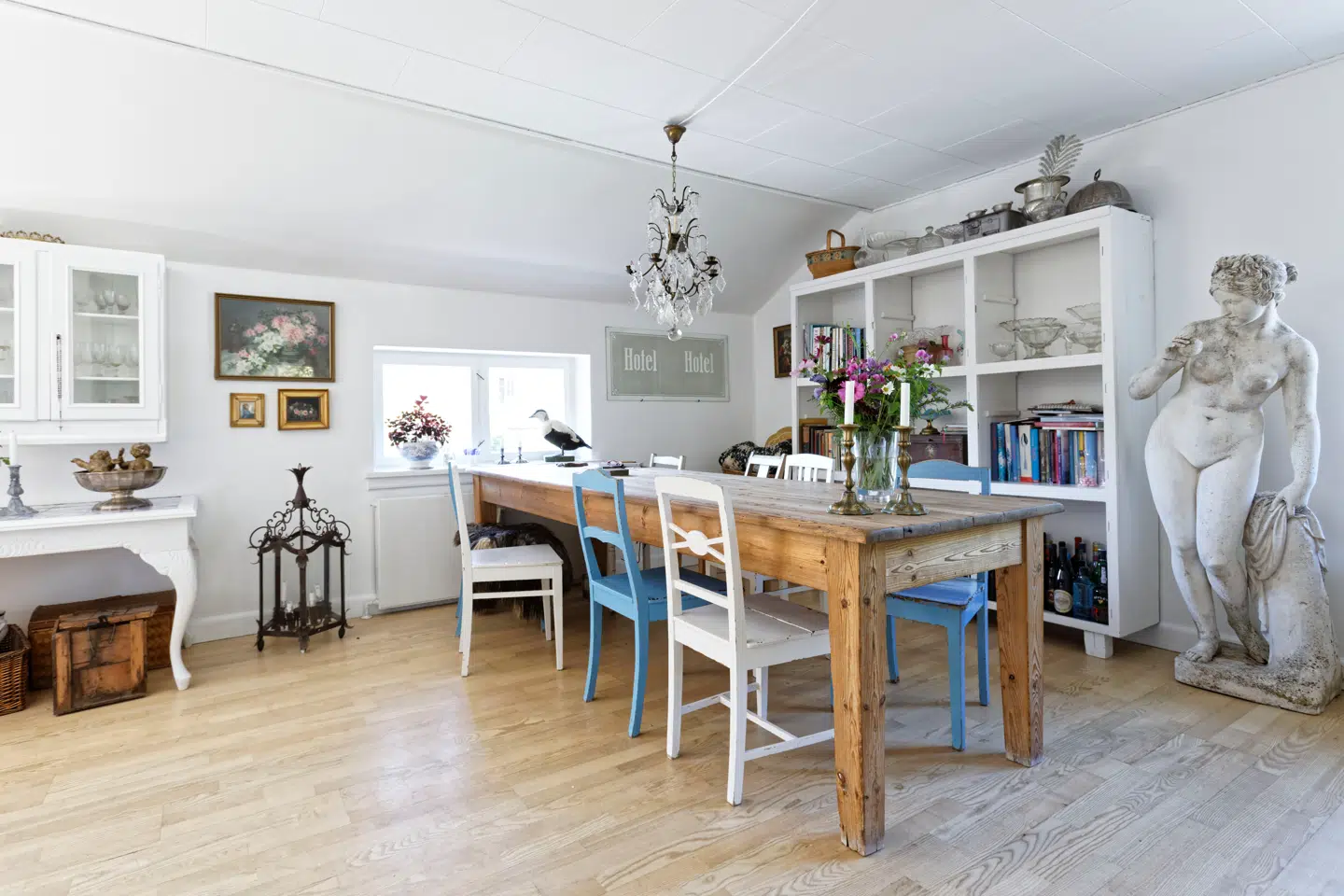 »Vi er ikke skraldere, men foretrækker nye ting og møbler. Der er nogle billeder, som er købt på auktion, men ellers er det meste købt nyt til vores tidligere boliger og taget med hertil. Af ældre ting er et vitrineskab i spisestuen fra Frankrig og en købmandsreol fra Frederiksberg overtaget fra en bekendt. Vores smag bliver enklere hele tiden. For hver gang vi er flyttet, har vi smidt noget ud.