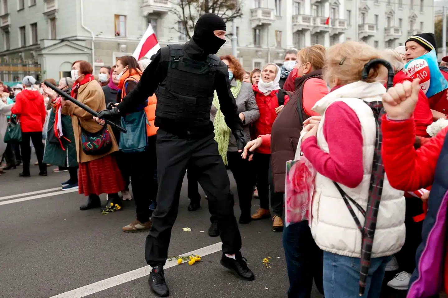 Seks maskerede mænd og tre kvinder var pludselig dukket op på den lille legeplads i deres gård og begyndt at skære de rød-hvide stofsløjfer af hegnet, der symboliserer den fortsatte protest mod diktatoren Aleksandr Lukasjenko.