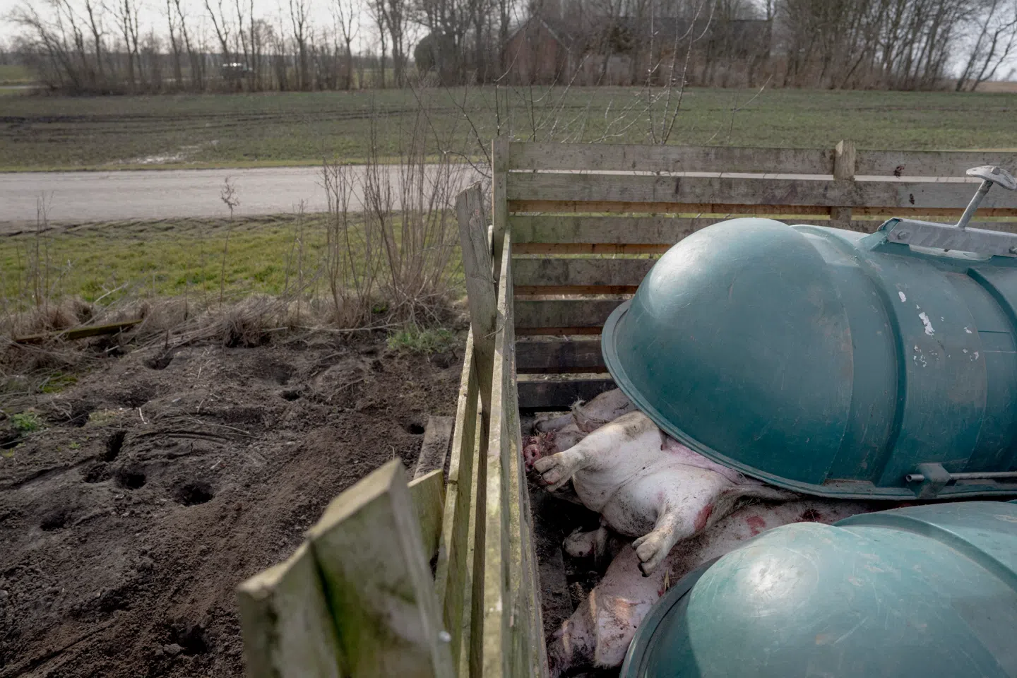 Mens vi taler med markleder og landmand Mike Sibbern, bliver døde grise aflæsset bag os. »Det er aldrig for sjov, at vi afliver dyr. Det gør vi først, hvis de ikke bliver bedre efter tre-fire dages behandling, hvis de er syge. Hver gang vi afliver, har vi et kæmpe økonomisk tab. Og desuden koster det også penge at komme af med dem,« forklarer han. Foto: Asger Ladefoged