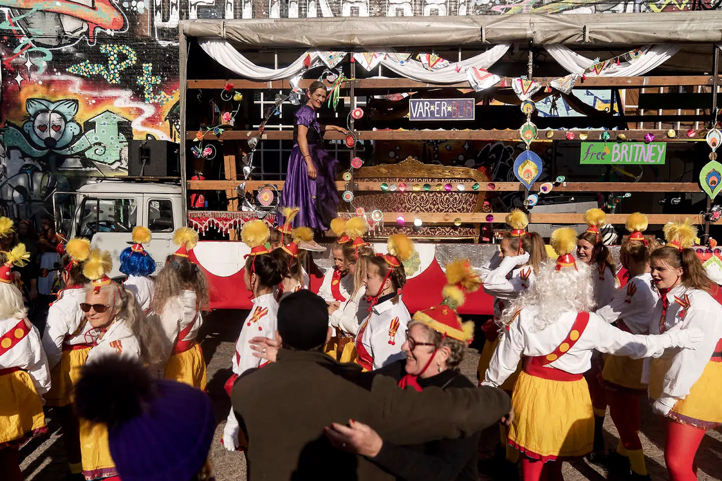 Det hele er et farverigt kaos, hundredvis af Christianitter går gennem byen, nogle klædt i Christianas røde og gule farver, andre i militærtøj med strutskørter, en mand klædt i grønt jakkesæt, en gruppe med blade og blomster kranset rundt om kroppen.