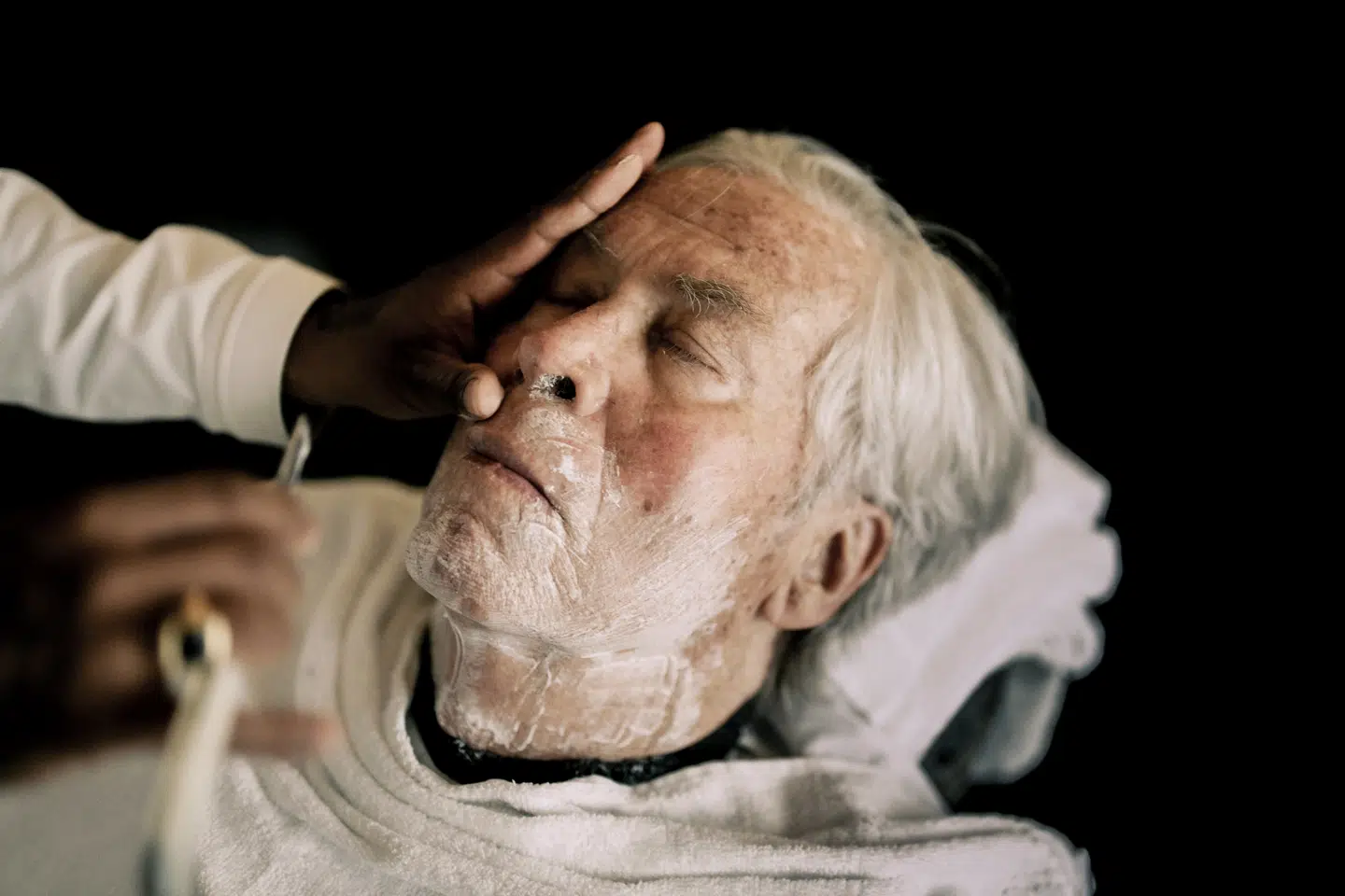 Jeg fik lov til at følge Jørgen Leths ugentlige ritual. Det begyndte i salonen i Vognmagergade, hvor hans faste barber gav ham en traditionel barbering med ragekniv.