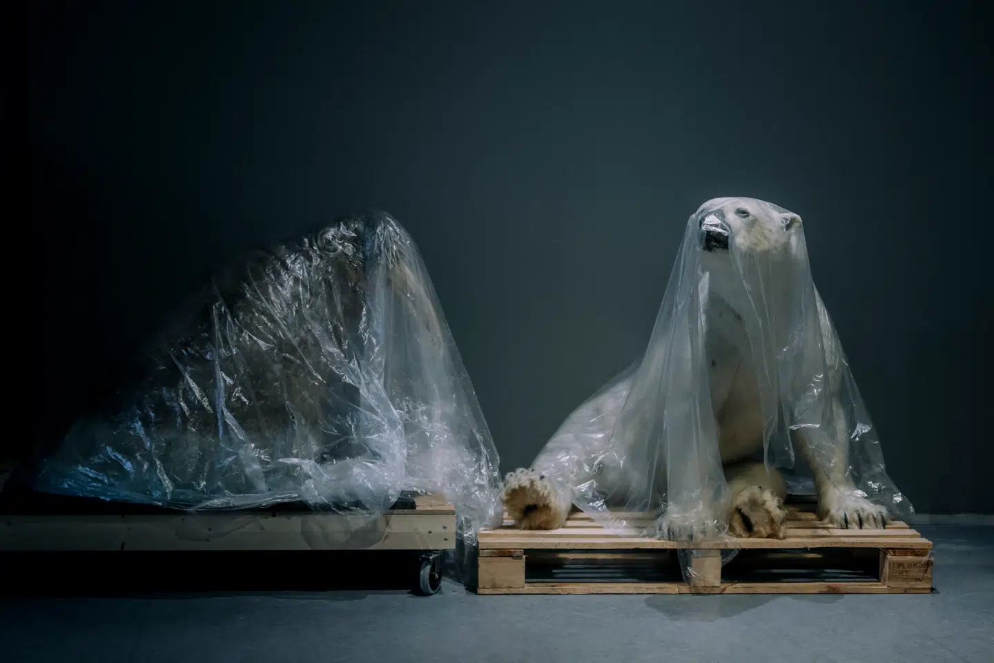 På en tom gang stod en isbjørneunge og et hvalroshoved – gjort klar og pakket ind i plastik. Som om tiden stod stille, mens de ventede på at blive vækket til deres næste liv.