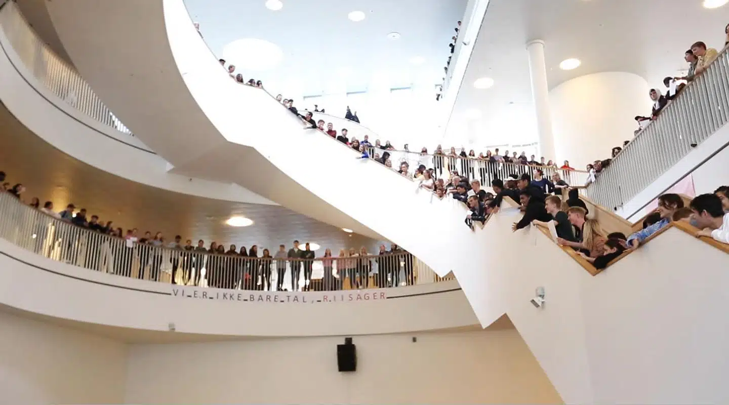 Undervisningsminister Merete Riisager (LA) skulle have deltaget i en debat om demokratisk dannelse på gymnasiet, men så langt nåede hun aldrig på grund af de hundredevis af elever, der råbte slagord i kor og buhede, da hun ankom. Debatarrangementet blev derfor aflyst. Det skriver Berlingske fredag.