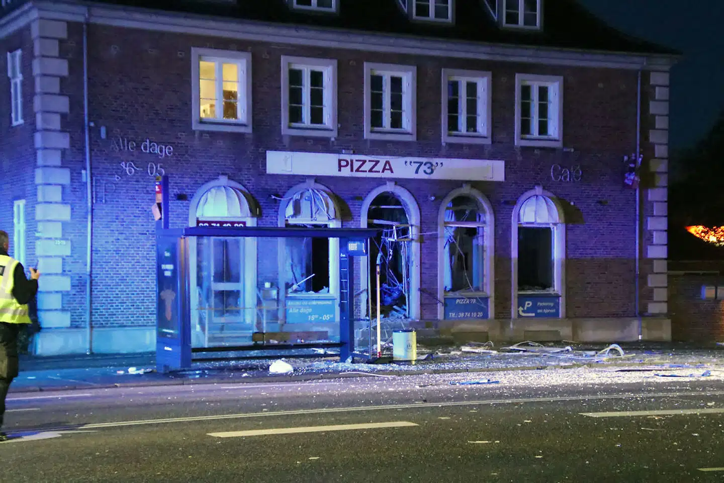 På selve bygningen er der ikke de store synlige skader. Vinduer er blevet ødelagt, så der ligger glasskår på fortovet.