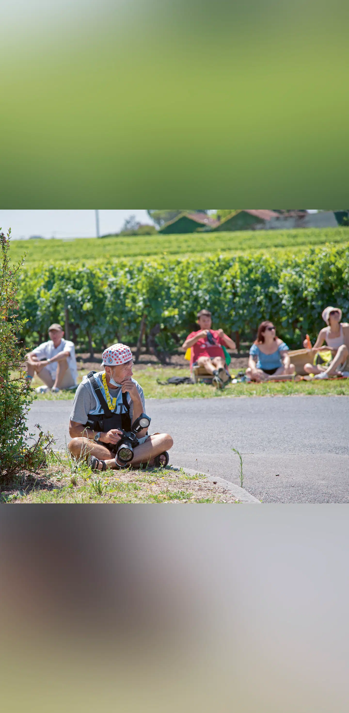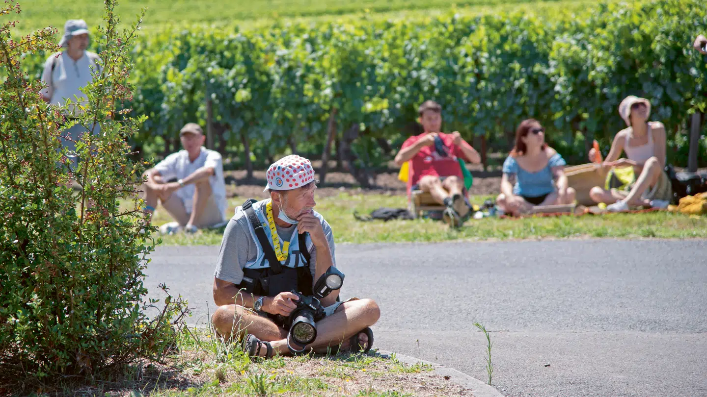 2O21. Fotografen på arbejde. Nils Mejlvang venter på feltet mellem vinmarker ved Saint-Émilion. Foto: Vincent Mejlvang.