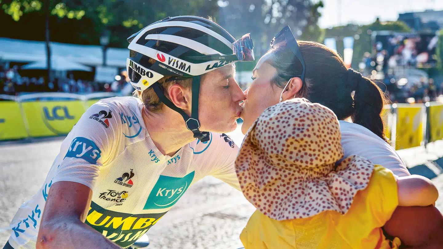 Jonas Vingegaard: »Det er lige, da vi er kommet i mål i Paris, og første gang, jeg ser min kæreste, Trine, og min datter, Frida. Det var bare helt fantastisk at se dem igen. Der er jo ingen, jeg hellere vil dele øjeblikkene med end dem, så det var bare virkelig fantastisk. Det er svært at sætte ord på … det var meget rørende for os. Der fældede vi nok begge to også en tåre. Det er helt vildt at tænke tilbage på. Jeg har aldrig i min vildeste fantasi turdet håbe på, at det var noget, der kunne ske. Det må jeg ærligt indrømme. At jeg skulle stå på podiet med min datter i Paris. Jeg synes, at hun er det skønneste i hele verden!«