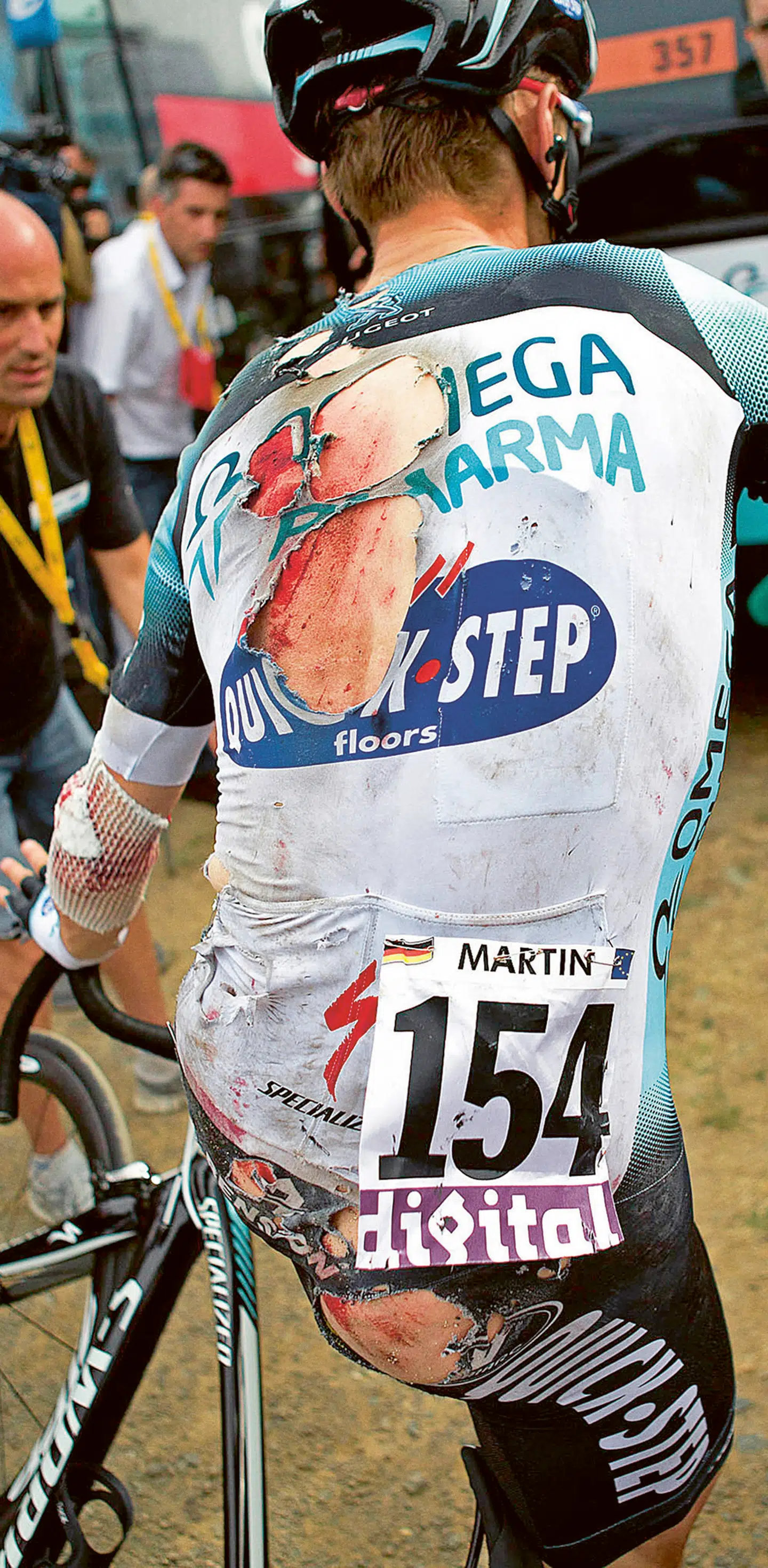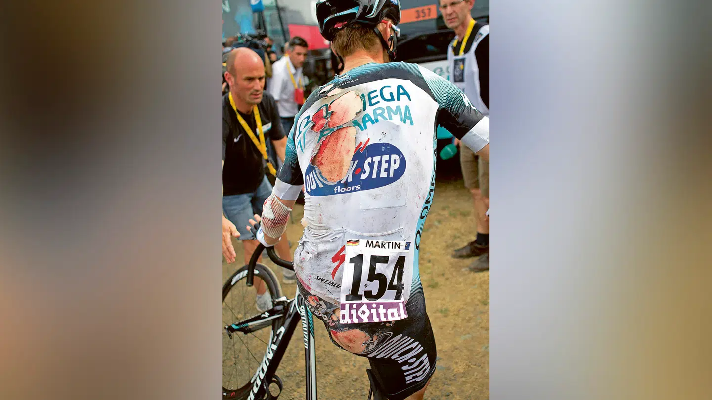 Tony Martin: »Holdbussen fra GreenEdge kører fast under “Flamme Rouge”-porten en kilometer før mål. Alt er kaos, og de råber og skriger på radioen, og er målstregen flyttet eller hvad? Midt i forvirringen og to-tre kilometer fra mål kommer der en rytter op bagfra og kører ind i mit styr. Jeg ryger ned. Asfalten er grov og med småsten, så jeg får flået huden af ryggen og min røv. Jeg aner ikke, hvordan jeg er kommet op på cyklen igen, og jeg husker ikke, at jeg kommer i mål. Men jeg finder hen til bussen, kommer af cyklen, hilser på min chef, Patrick Lefevere, og går op i bussen og besvimer. Jeg vågner igen, da lægerne forsøger at pille grus og småsten ud af mine sår.«