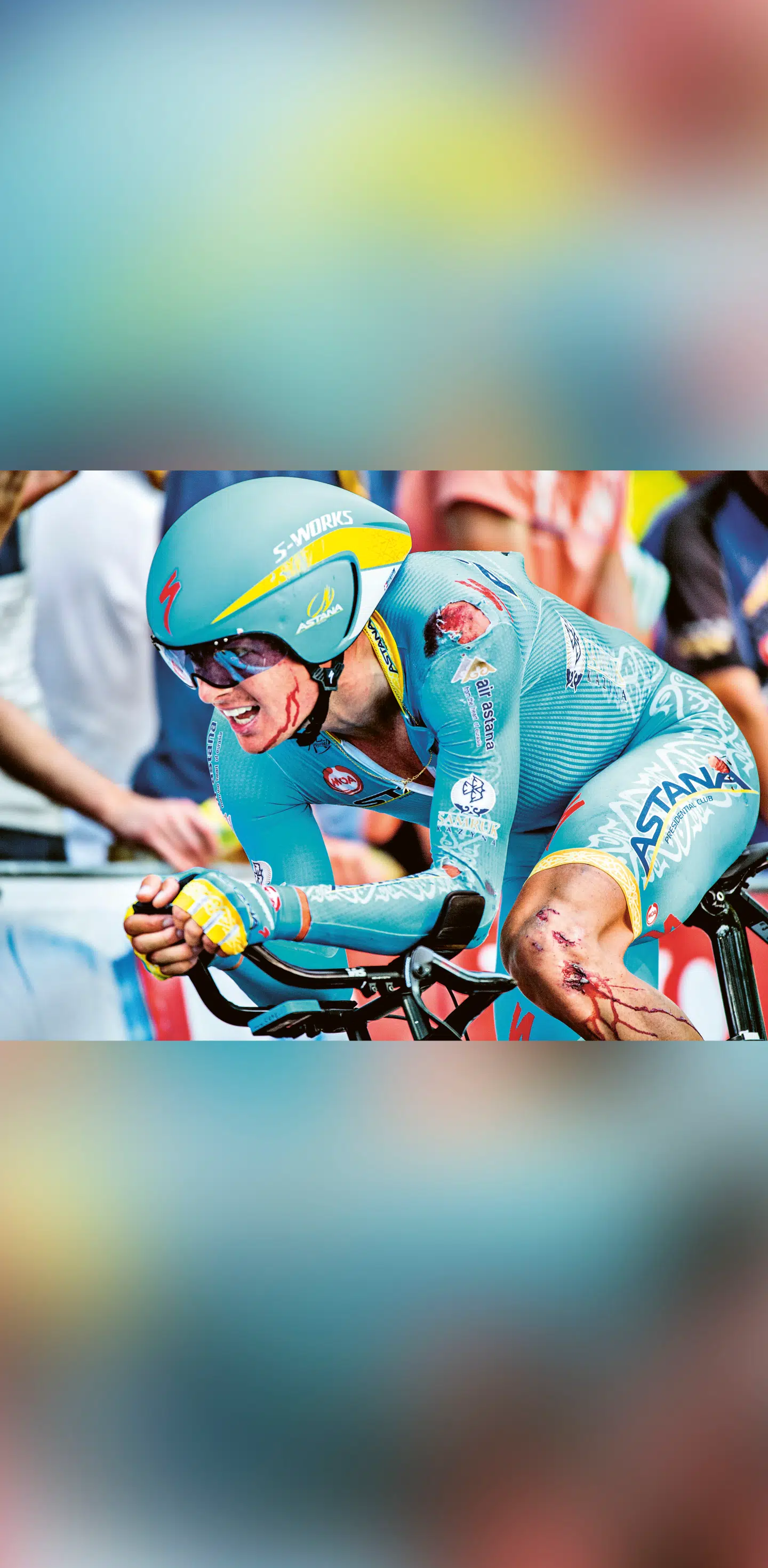 Jens Voigt: »Fantastisk billede og dybest set historien om mit liv i ét billede: Jeg arbejder hårdt med smertens-grimasse i mit ansigt, mens jeg hjælper min ven og leder, Andy Schleck. Og på samme tid maser jeg alle andre gennem kødhakkeren, og jeg elsker det! Vi nærmer os toppen af Col du Petit-Saint-Bernard. Vi begynder nedkørslen, og jeg lader mig falde lidt tilbage for at hente vand. Så husker jeg ikke mere, og jeg ønsker heller ikke at huske mere, for det var et frygteligt styrt. Men det næste, jeg husker, er, at jeg vågner og ser det indre af en ambulance og har frygtelige smerter. Så besvimer jeg igen. Derefter husker jeg kort at flyve i helikopter. Mine skader var for voldsomme for det lokale hospital.«