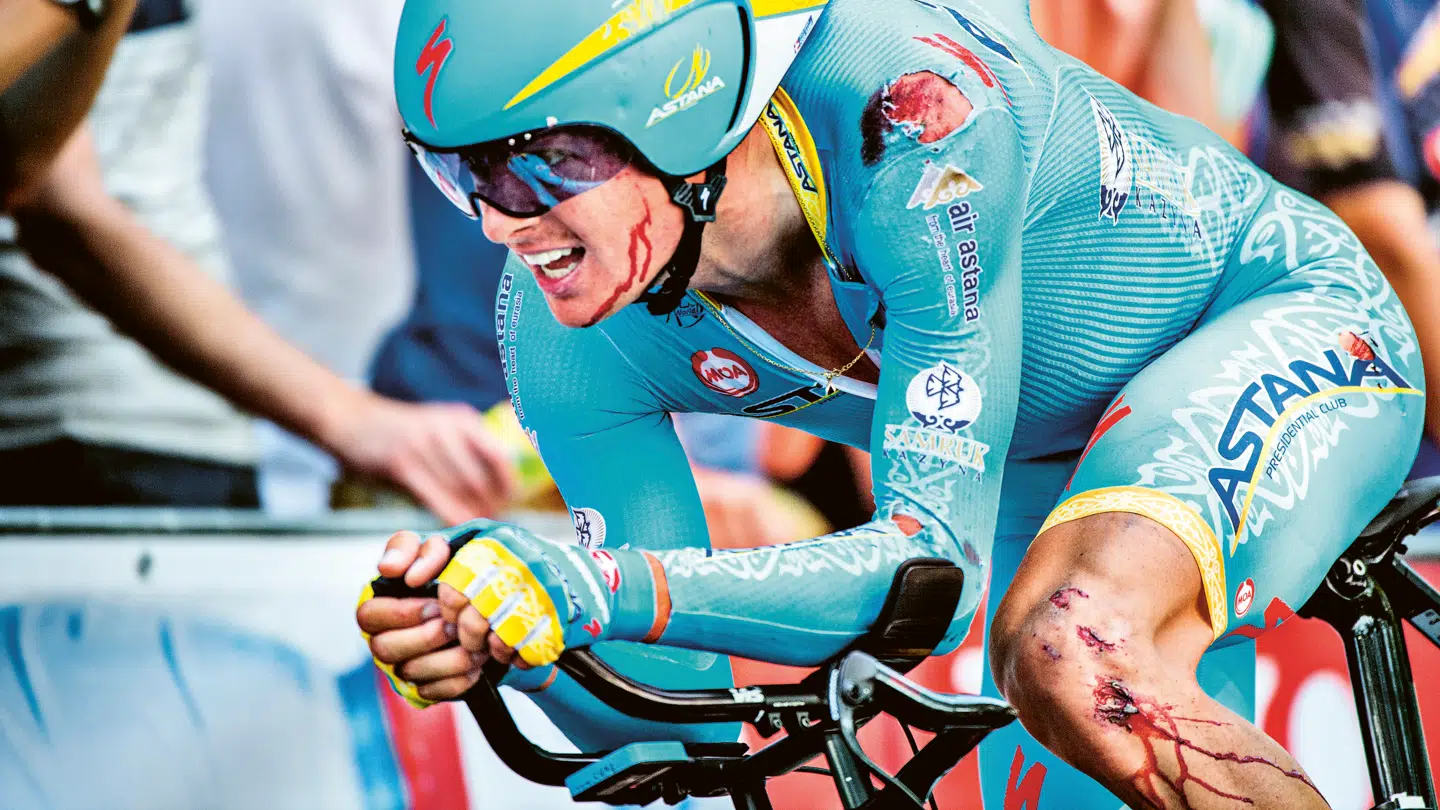 Jakob Fuglsang: »Jeg satsede for meget, havde for meget fart på og kom for hurtigt rundt i et sving. Så ramte jeg kantstenen på en midterhelle, og så røg jeg rundt. Men så er det bare om at komme op igen og komme videre, der er ikke så meget andet at gøre. Jeg er nok blevet lidt mere forsigtig med årene, men når jeg sætter mig op til en enkeltstart og gerne vil køre klassement, så ved jeg, at jeg er nødt til at tage chancer, for ellers taber jeg for meget tid. Men det skal gerne være en kalkuleret risiko. Til stregen, men ikke over den.«