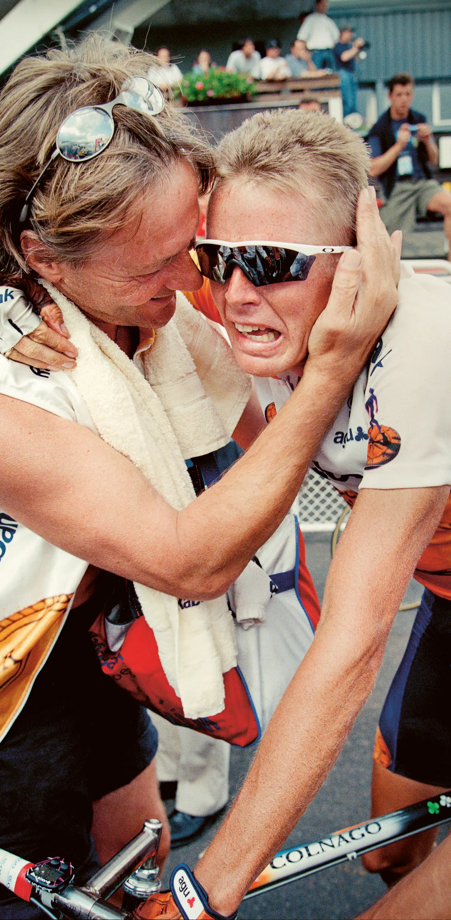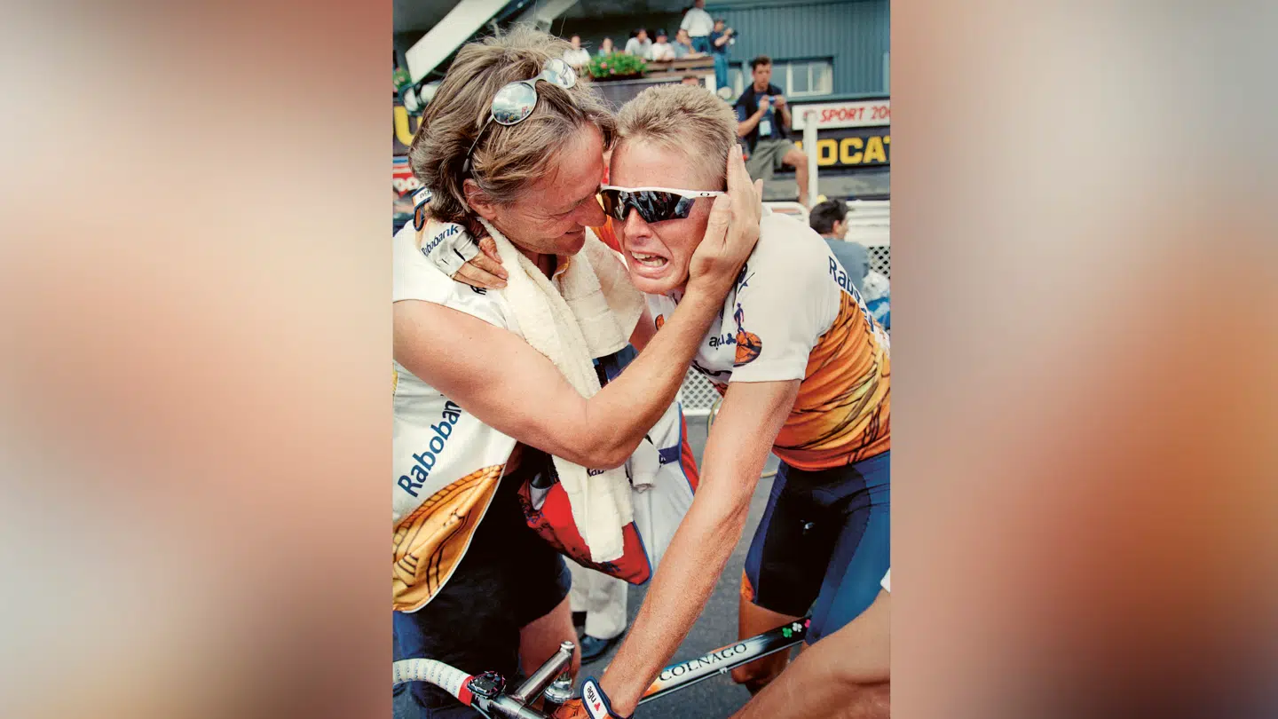 1996. 13. etape til SuperBesse. Etapevinder Rolf Sørensen og hans soigneur, Ton van Engelen.
