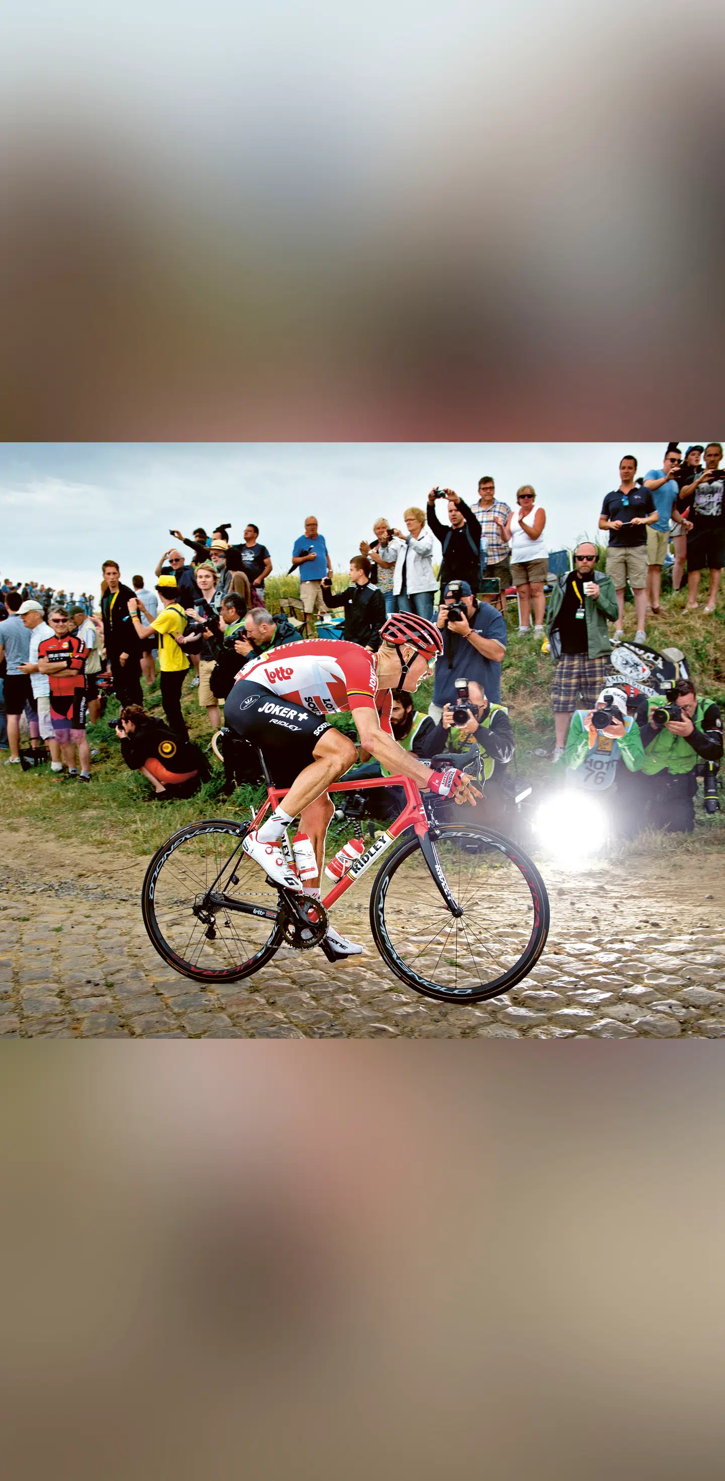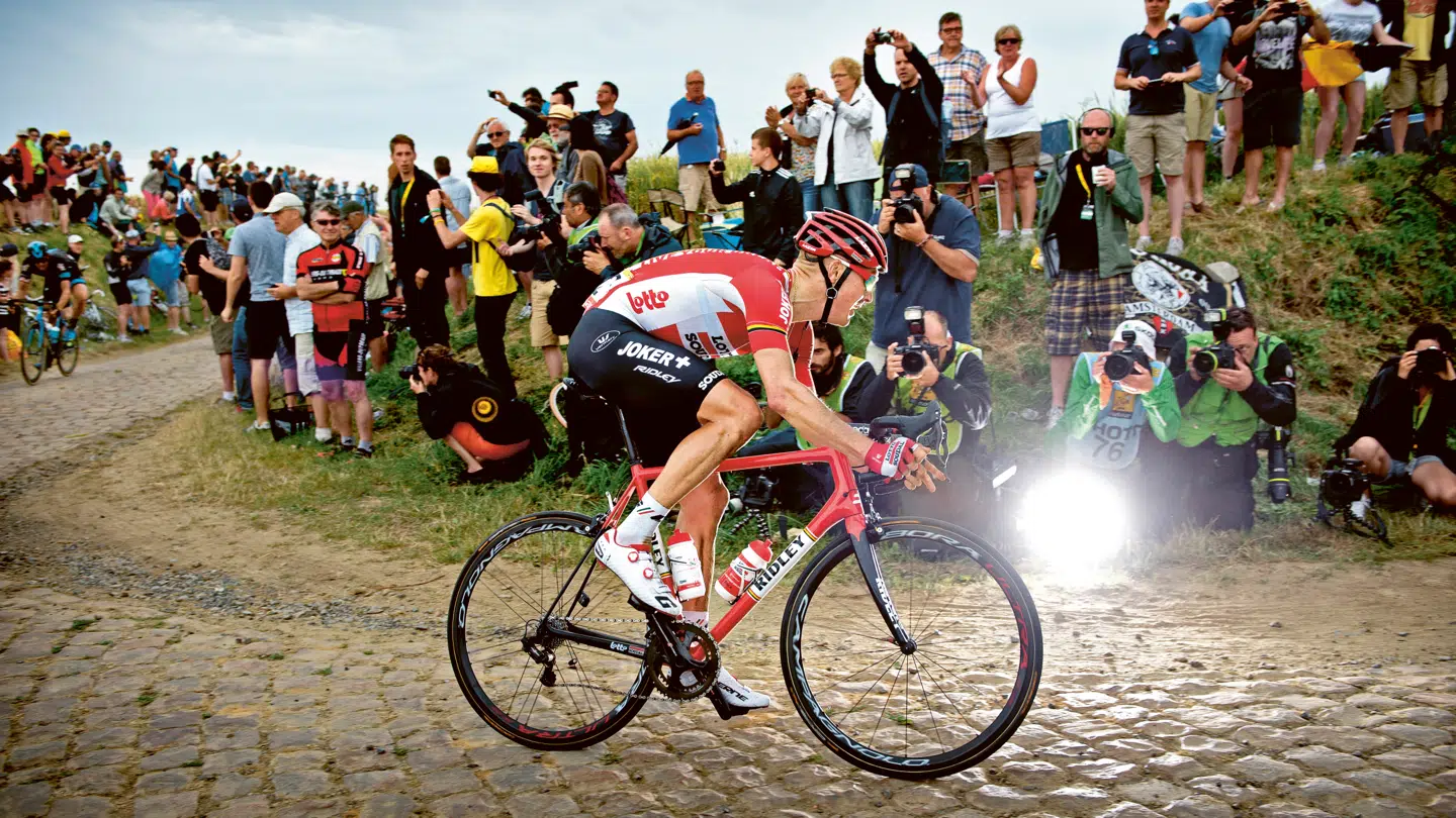 Lars Bak: »Her kører jeg ret alene og jagter feltet med Ian Stannard fra Sky bag mig, fordi jeg lige har været punkteret. Jeg har altid været godt kørende på brosten i Touren. Det er jo hele verdenseliten, der kører Tour de France. Men det er ikke nødvendigvis de bedste på brosten. Bjergrytterne er jo ved at pisse i bukserne, når de skal køre sådan en etape.«