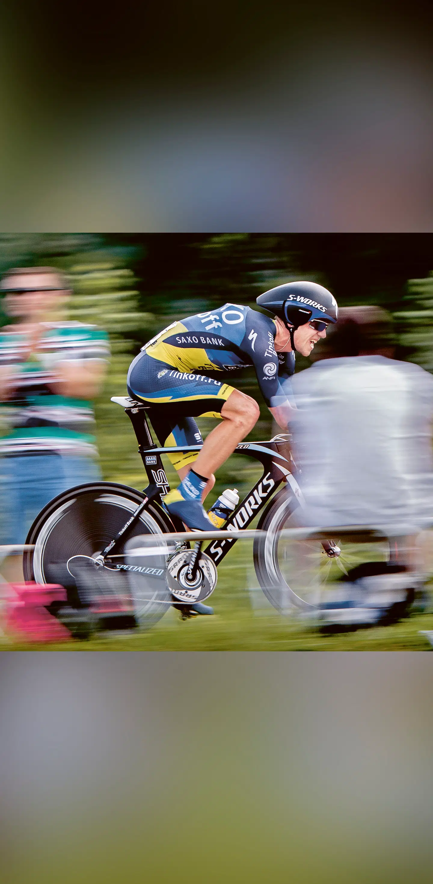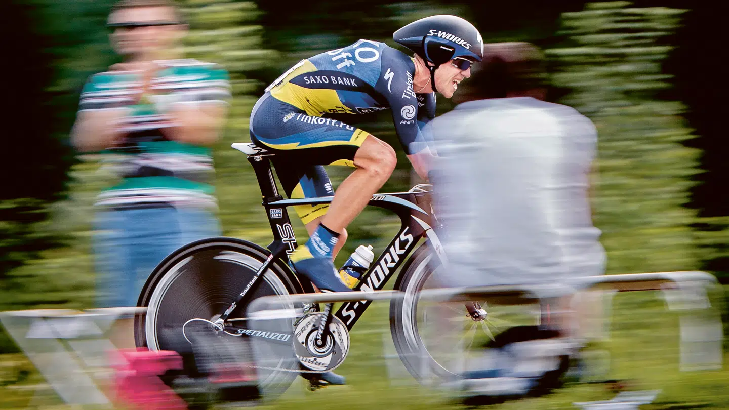 Chris Anker Sørensen: »Jeg har aldrig været nogen enkeltstartshaj, men jeg kørte da en relativt pæn enkeltstart lige den dag, og når jeg ser på billedet, ser det da ud til at gå ok hurtigt. Enkeltstart blev jo aldrig en disciplin, jeg ligesom elskede. Er du sindssyg, jeg er glad for ikke at skulle køre det lort mere. Altså, det var fandens hårdt, og det var skrækkeligt at sidde på den enkeltstartscykel. Det var bare 50 minutter i helvede. I min verden var den cykel noget af det ypperste, vi kunne køre med. Den var virkeligt godt lavet af Specialized, en totalt fed cykel, så der var ingen undskyldning der. Det var noget af et bæst. Når man kigger på den, kan man tydeligt se, at den ser hurtig ud. Hele billedet ser hurtigt ud. Man kan dårligt se ham i baggrunden i den fede 90’er-trøje.«