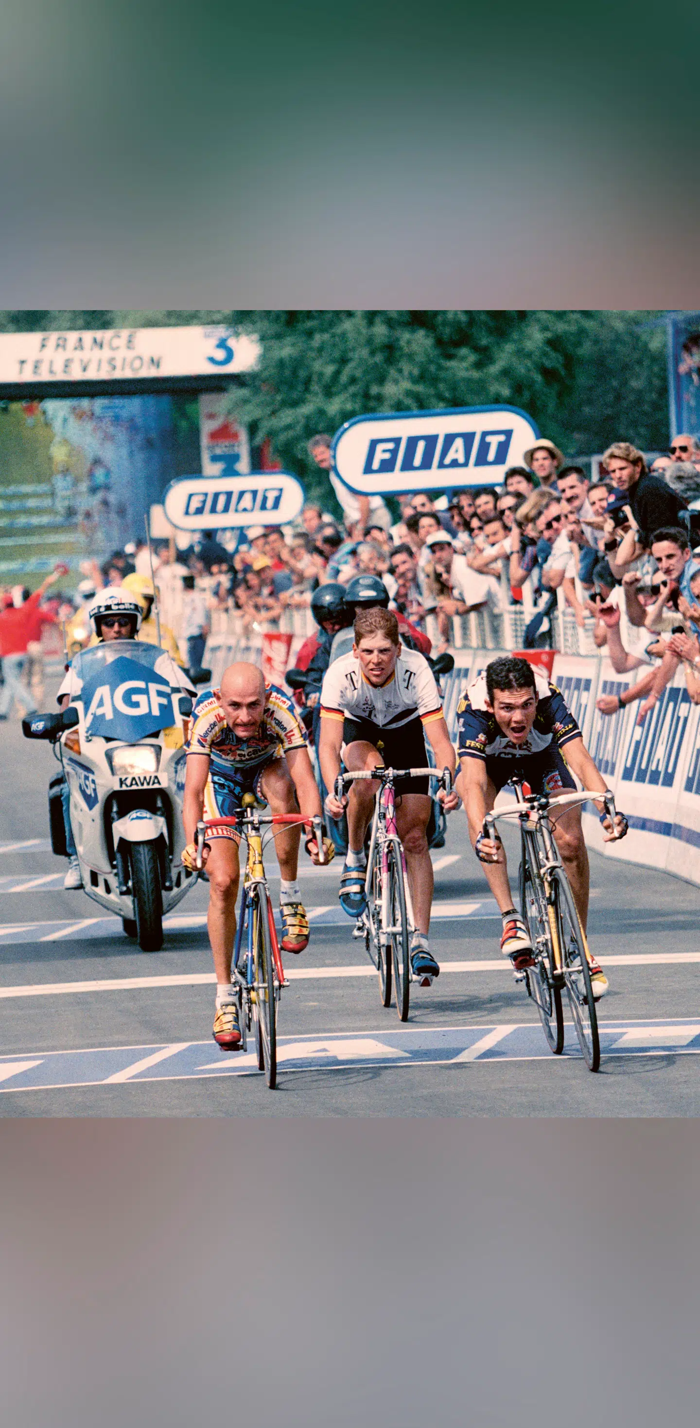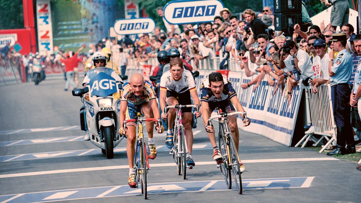 1997. 9. etape til Loudenvielle. Marco Pantani, Jan Ullrich og Richard Virenque.
