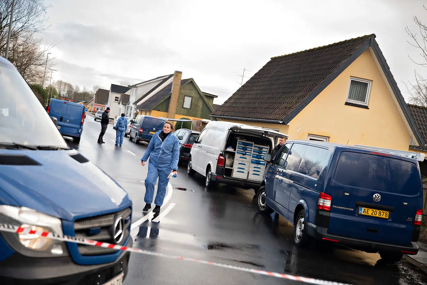 Her kan de se, hvordan politiets efterforskere og teknikere, nogle af dem klædt i store blå sporsikringsdragter arbejder i en gul ejendom. En ejendom, der agerer bopæl for en af de to nordjyske mænd, politiet har anholdt onsdag formiddag.