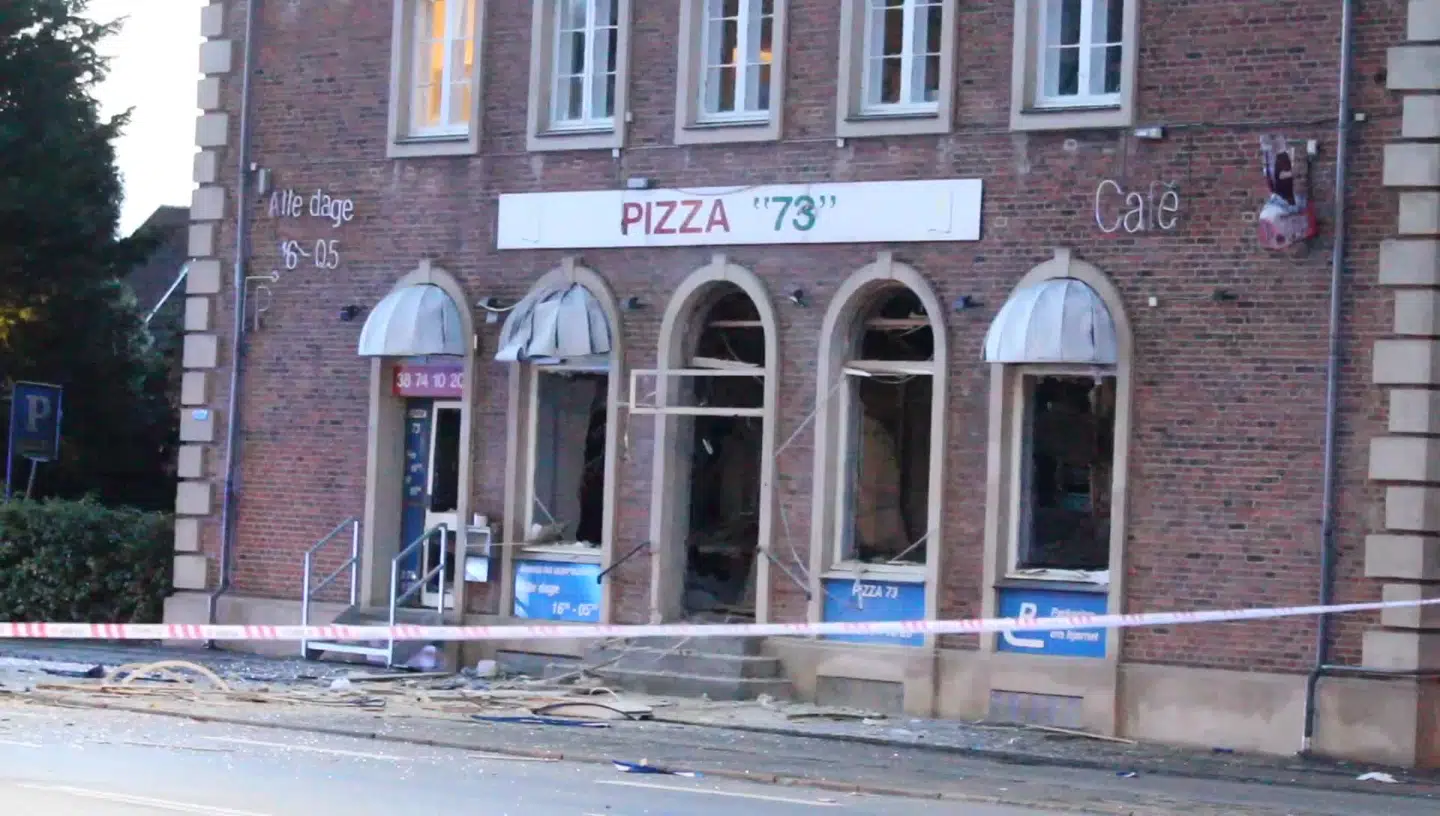 Ingen kom til skade ved eksplosionen, men fem store vinduespartier er blæst ud af pizzeriaet.
