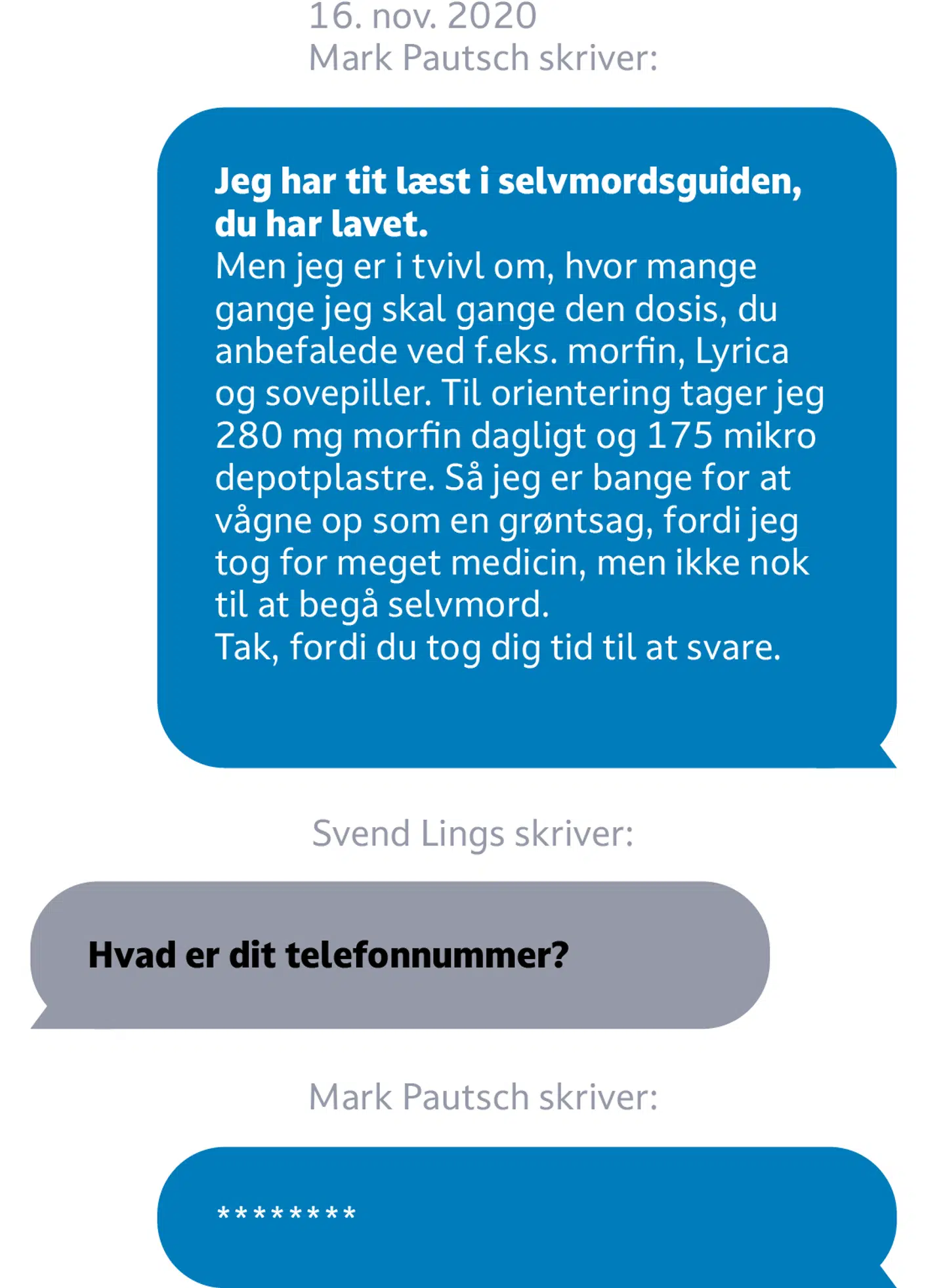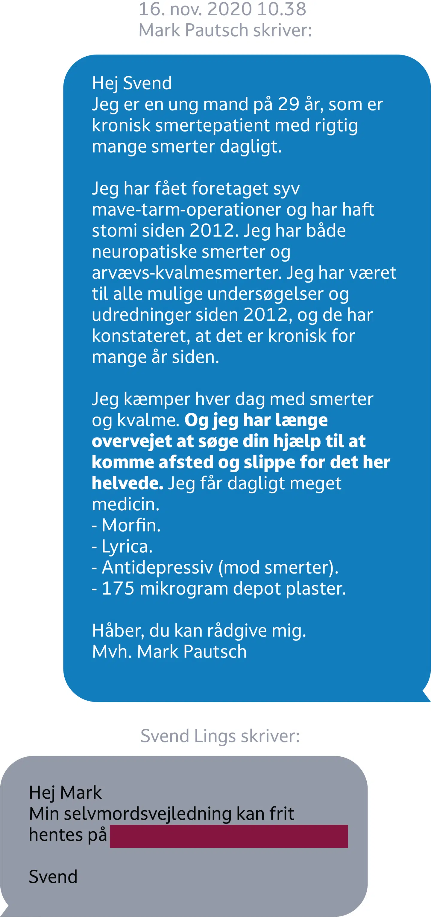 Mark Pautsch døde en novemberdag i 2021. Kort før sin død havde han været i kontakt med tidligere læge Svend Lings, som er kendt for at rådgive uhelbredeligt syge i at tage eget liv. Det fremgår af beskeder via Facebook mellem Svend Lings og Mark Pautsch.