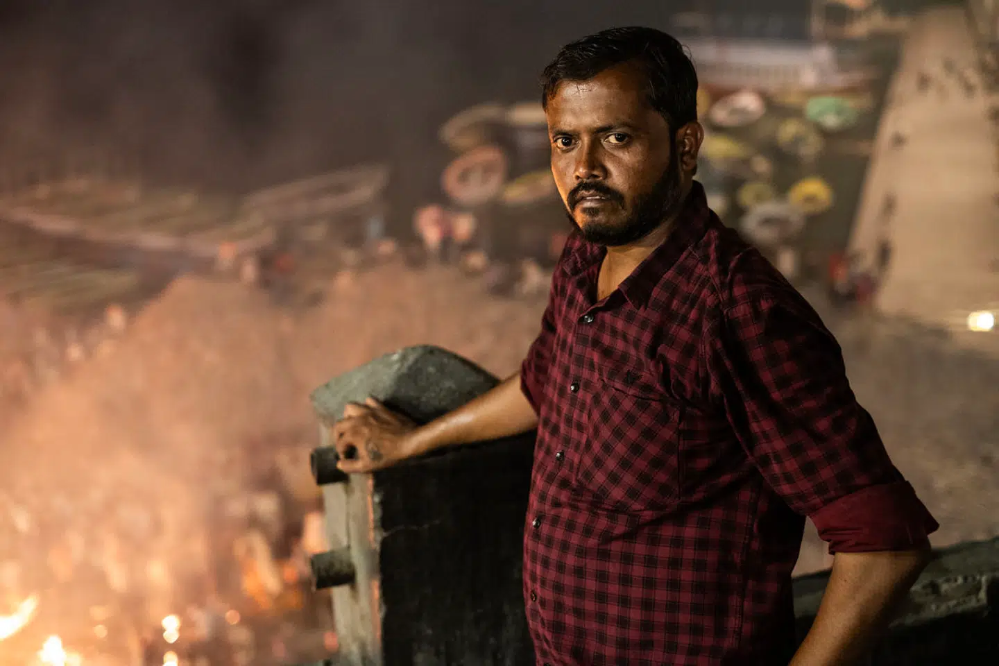 Der står to mænd med AK-rifler i skyggen af et træ. De tager bidder af dets bitre, umodne mangofrugter, mens deres øjne følger Shivam Dubey.