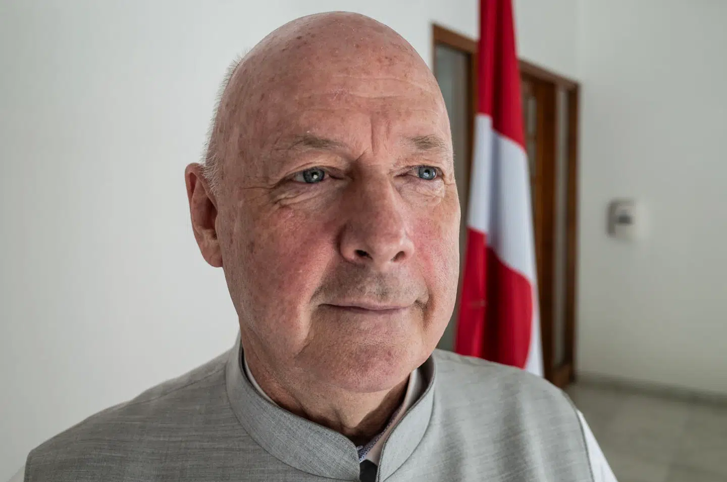 Han er nem at få øje på, takket være sin bordeauxrøde turban og sit unge ansigt, og han er samtidig den eneste, der taler.