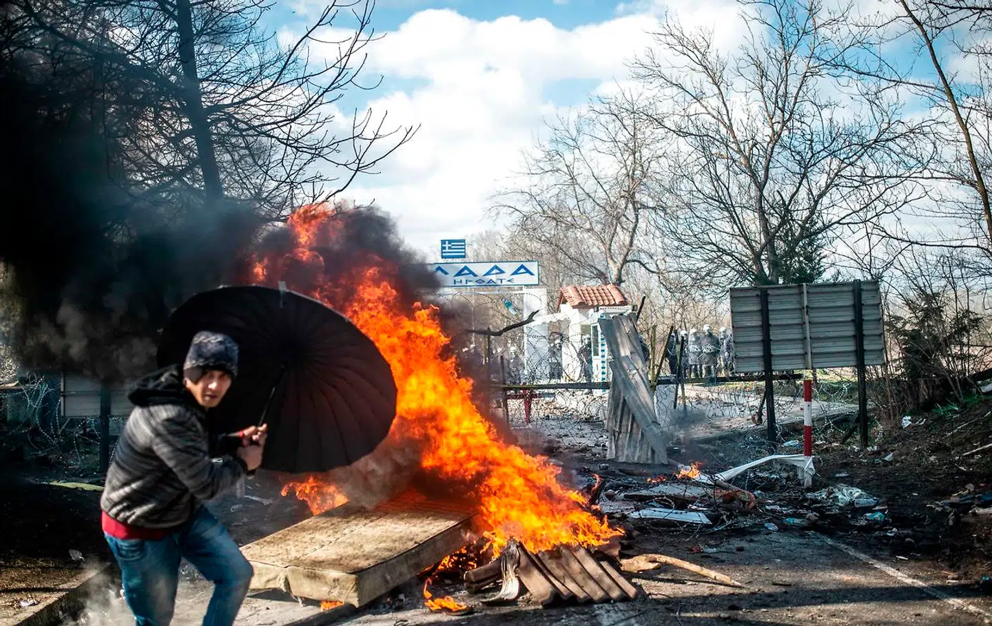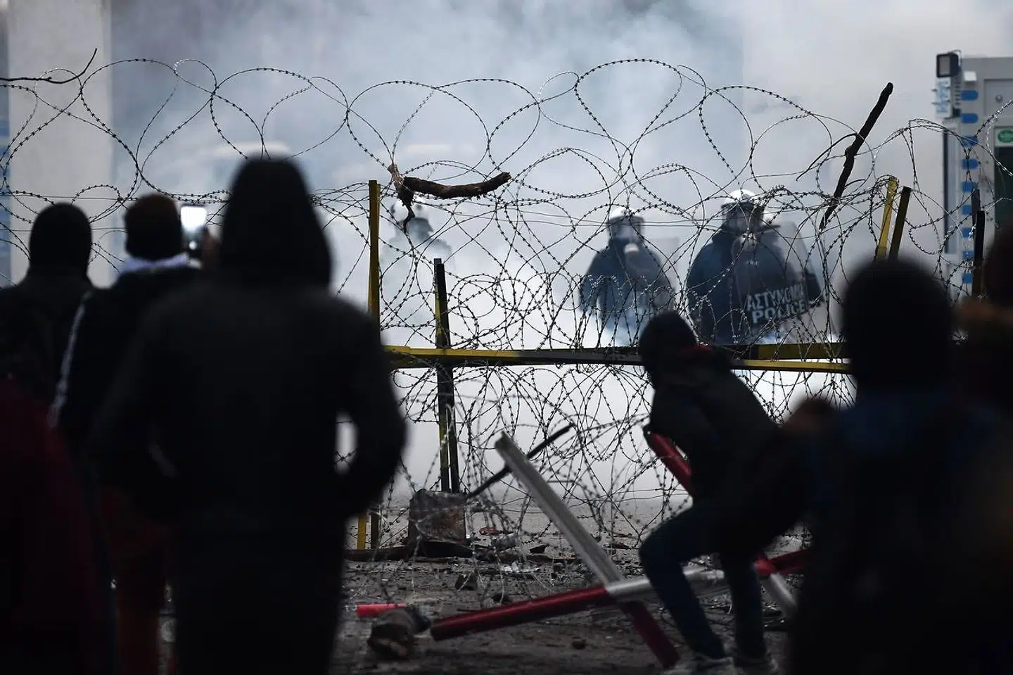 Nogle af de mange flygtninge og migranter kaster med sten mod de græske betjente.