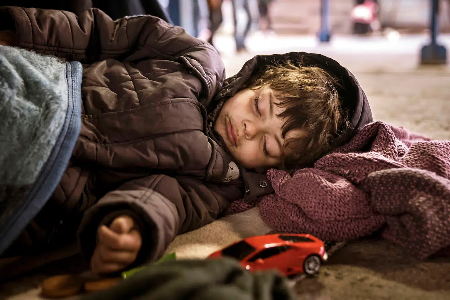 Mohammad Ali på tre år og otte måneder sover i en basar i byen Edirne ikke langt fra grænsen til Grækenland. Det har regnet om natten, så mange flygtninge og migranter har søgt i ly i basaren.