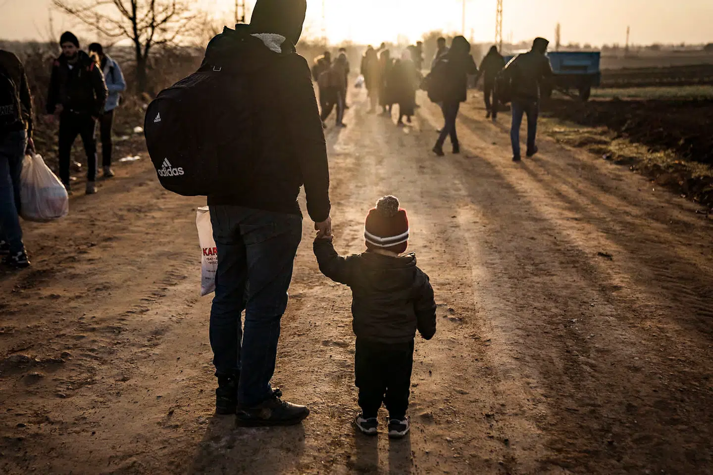 En far står med sin søn i nærheden af grænsen til Grækenland.