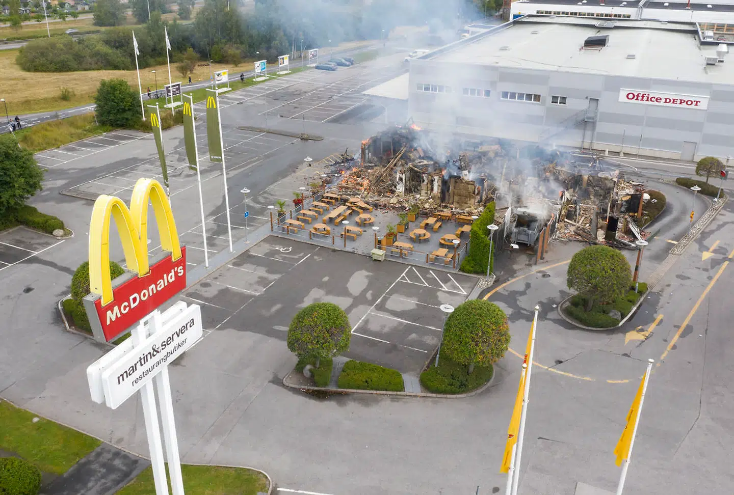 Klokken to natten til fredag så en forbipasserende flammer stå op af McDonald’s-bygningen og fik hurtigt tilkaldt hjælp. På trods af over 30 brandmænd og andet redningsmandskab, så stod bygningen ikke til at redde, skriver Expressen.