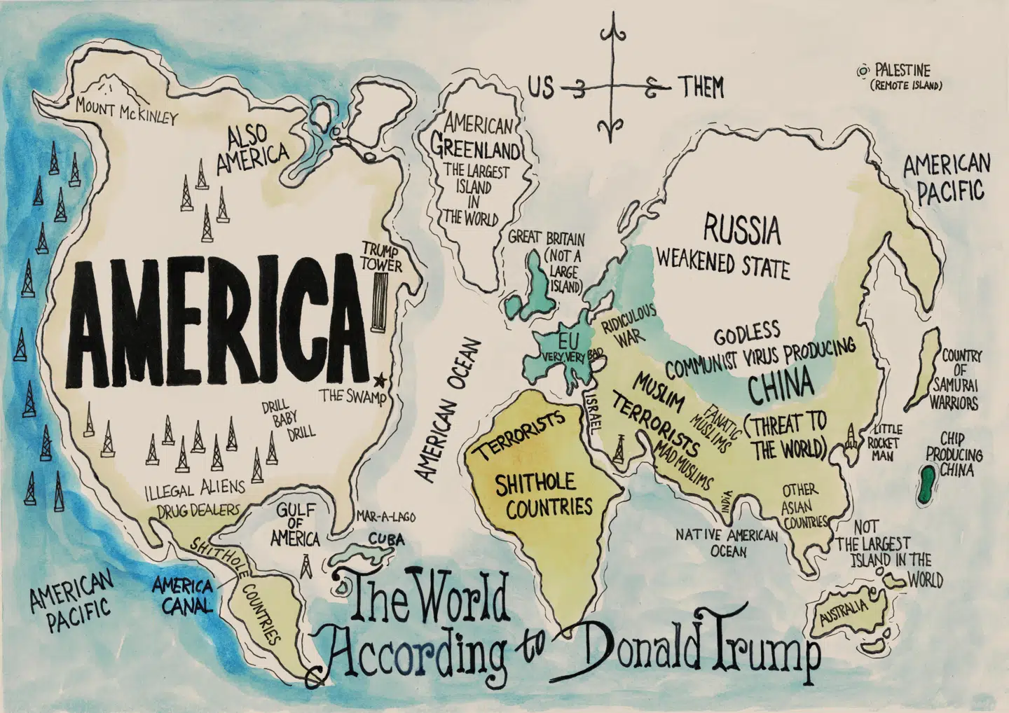 Med udgangspunkt i Trumps udtalelser og med inspiration fra David Horseys »The world according to Ronald Reagan« og Thomas P.M. Barnetts »The Pentagon's New Map« har Claus Gade Sørensen tegnet dette satiriske verdenskort af Donald Trumps verdensbillede.