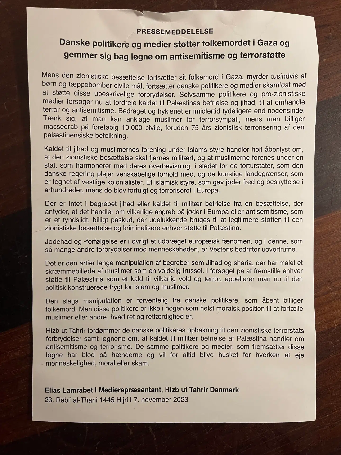 Islamistiske organisationer som Hizb-ut-Tahrir, der ønsker kalifatet indført, er drivende for en væsentlig del af pro-Palæstina-opinionen. Selv fik jeg forleden dette flyveblad i postkassen, håndomdelt i kvarteret: