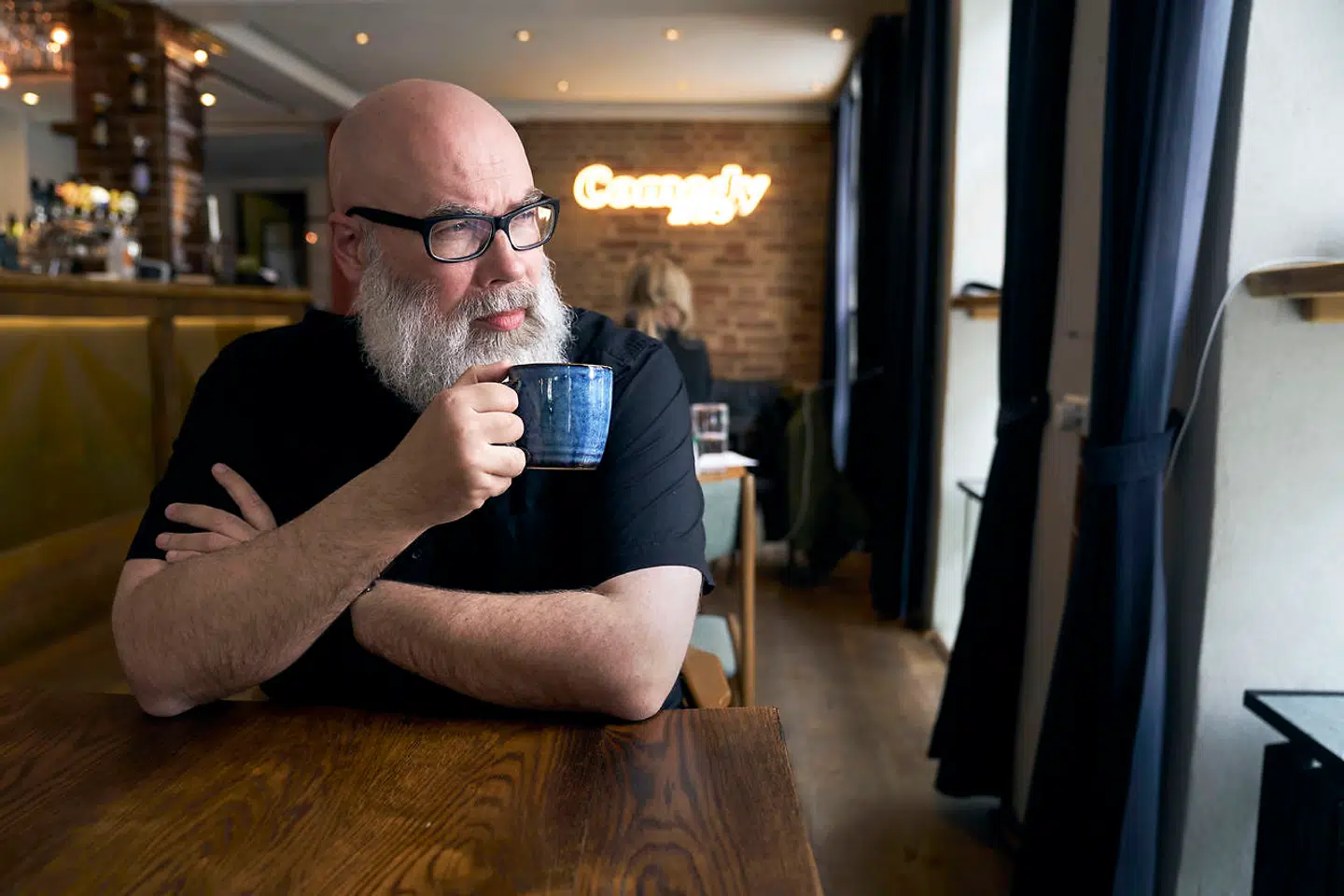 Alligevel griner Brian Mørk. Med sprækkeøjne, klukken fra maven og skuldrene trukket op. Det er afvæbnende og velsagtens en refleks for en mand, der er standupkomiker og lever af at få andre til at grine. Men oprigtigt talt: Der er ikke noget at grine af.