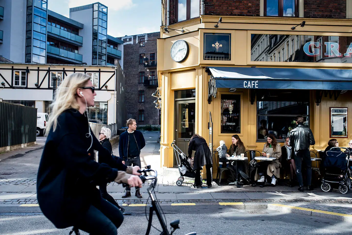 Han møder os på vejen, hvor biler og cykler på forunderlig vis finder en civiliseret måde at passere hinanden på det smalle stykke mellem Vesterbrogade og Gammel Kongevej. At kalenderen viser oktober, afholder ikke folk fra at krybe sammen på bænken foran vinbaren Falernum. Det samme gælder nabocafeen Montgomery, der har gjort en undtagelse i forhold til de franske referencer. For ikke at tale om kaffebaren Rist og Granola, hvor der er fyldt godt op inde som ude.