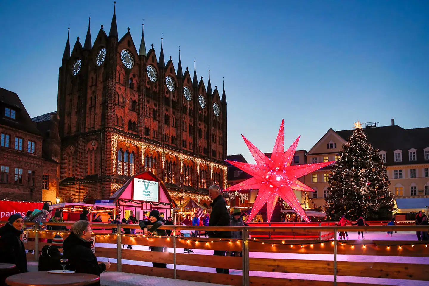 Julemarkedet i Stralsund fordeler sig på centrums to store pladser, Alter Markt og Neuer Markt. På sidstnævnte plads troner den imponerende Marienkirche med det 104 meter høje ottekantede tårn over pladsens livlige julemarked med blinkende forlystelser a la byfesttivoli og boder fulde af sukkersager. På Alter Markt dominerer byens rådhus fra 1290 udsigten fra julemarkedsboderne, hvor folk varmer sig på