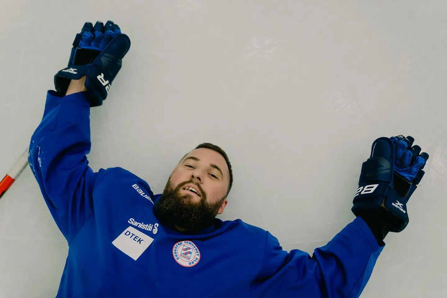 Da han kommer helt op ad de få trin, lægger han sin hånd på det højre armlæn på stolen, jeg sidder på.
