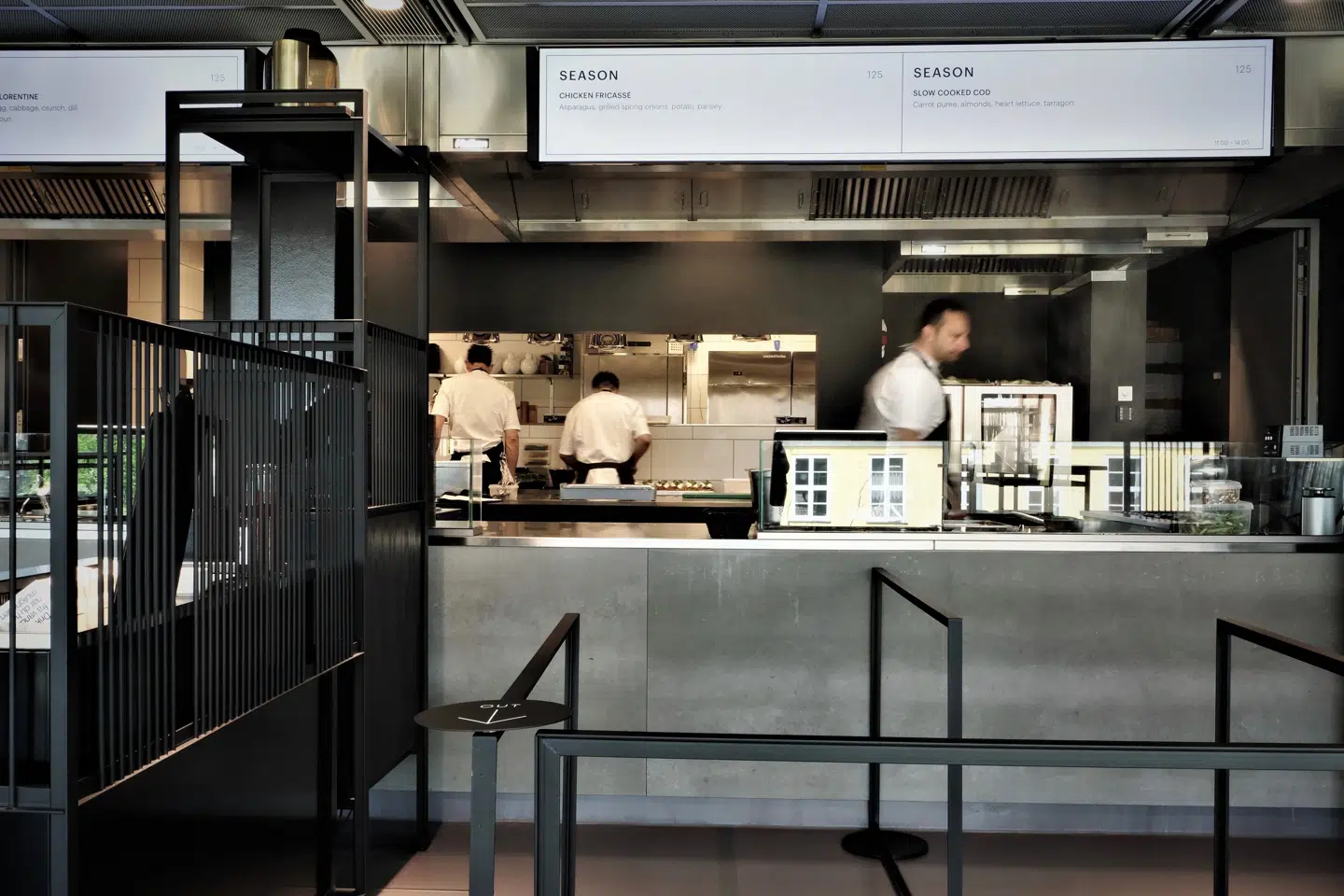 Restauranten rejser sig i to etager og drives af Meyers Kantiner. I stuen ligger et såkaldt »cafeatery«, hvor man kan spise lette retter, og på førstesalen finder man en såkaldt »Food Hall«, hvor man kan bestille mindre anretninger. Det foregår ved madstationer, hvor man via fladskærme bliver guidet til både valg af menu og betaling.