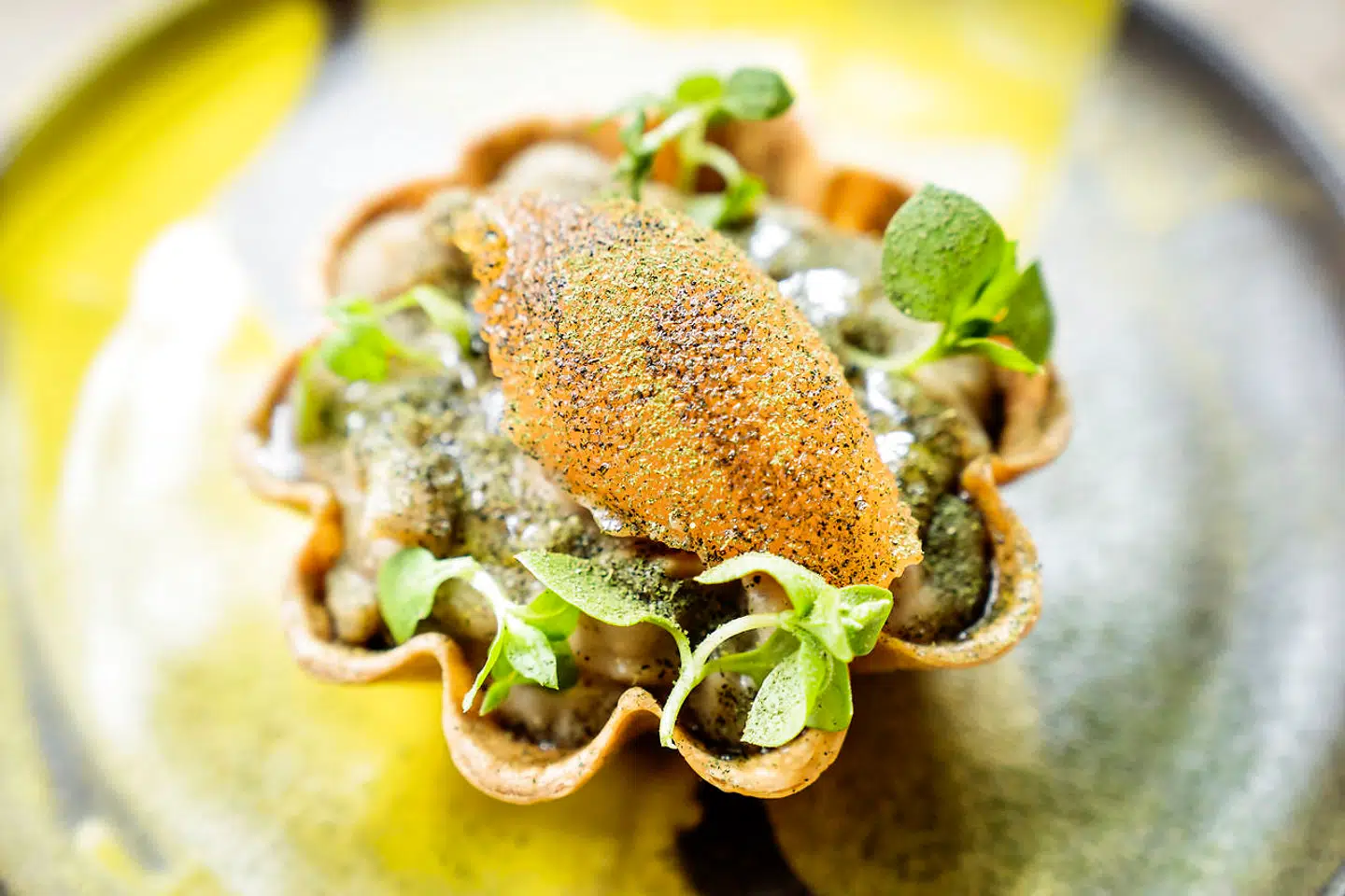 Næste servering var et meget vellykket indslag fra det veganske køkken. Saltbagt selleri med misomayo, sprødt hvidløg og limeskal. Her viste køkkenet, hvad det var i stand til, når fusionsmotoren først var blevet varm. Et meget velsmagende og samtidig originalt og sofistikeret stykke smørrebrød med lækre teksturer og en formidabel lang eftersmag, som mindede om fedmen i cashewnødder.