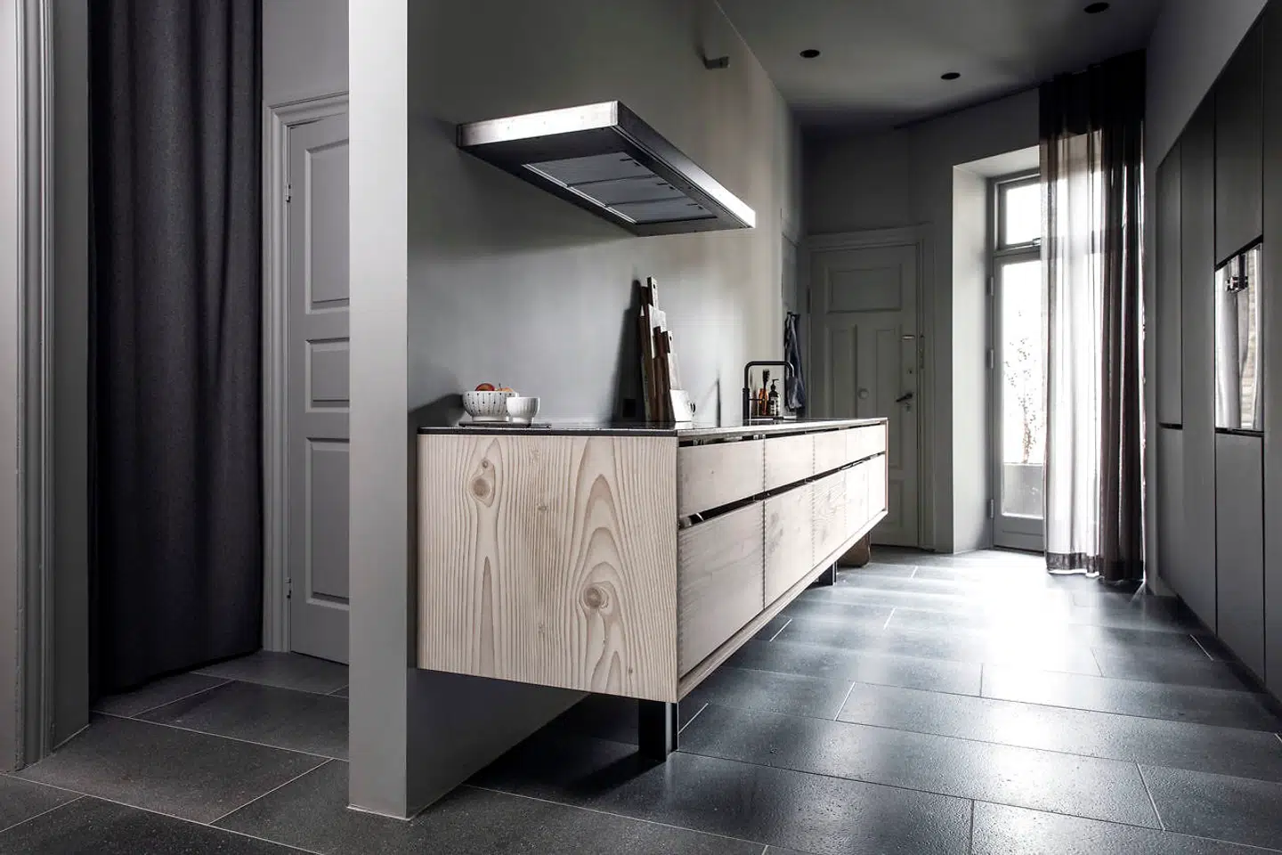 »Varme i gulvet! Det er så dejligt, ikke mindst fordi vi har små børn. Og så vidste vi, at vi ville have Made A Manos lavastensfliser i sildebensmønster i præcis den gråblå nuance. Det er så smukt, og på forunderlig vis passer det bare virkelig godt, selv i det lille rum. Det smarte ved sildebensmønstret er, at det er et mønster, der kan fungere på små flader. Hvis vi havde valgt et andet mønster, skulle fliserne alligevel skæres i mønsteret. For at skabe ro har vi holdt vægge og loft helt i hvid, og fordi vi har prioriteret gulvet økonomisk, har vi valgt de billigste hvide fliser til væggene. De er dejligt neutrale, langtidsholdbare og larmer ikke visuelt.«