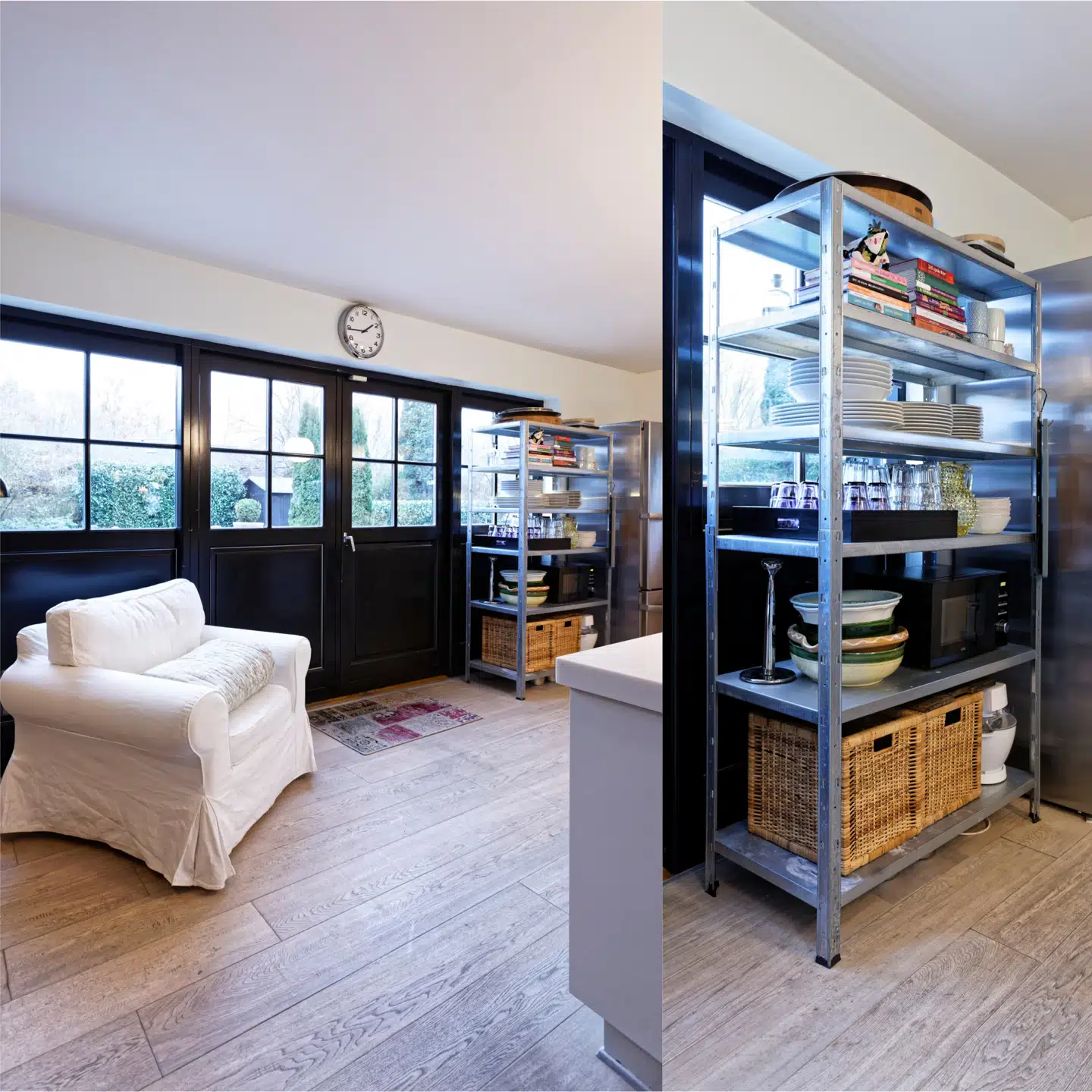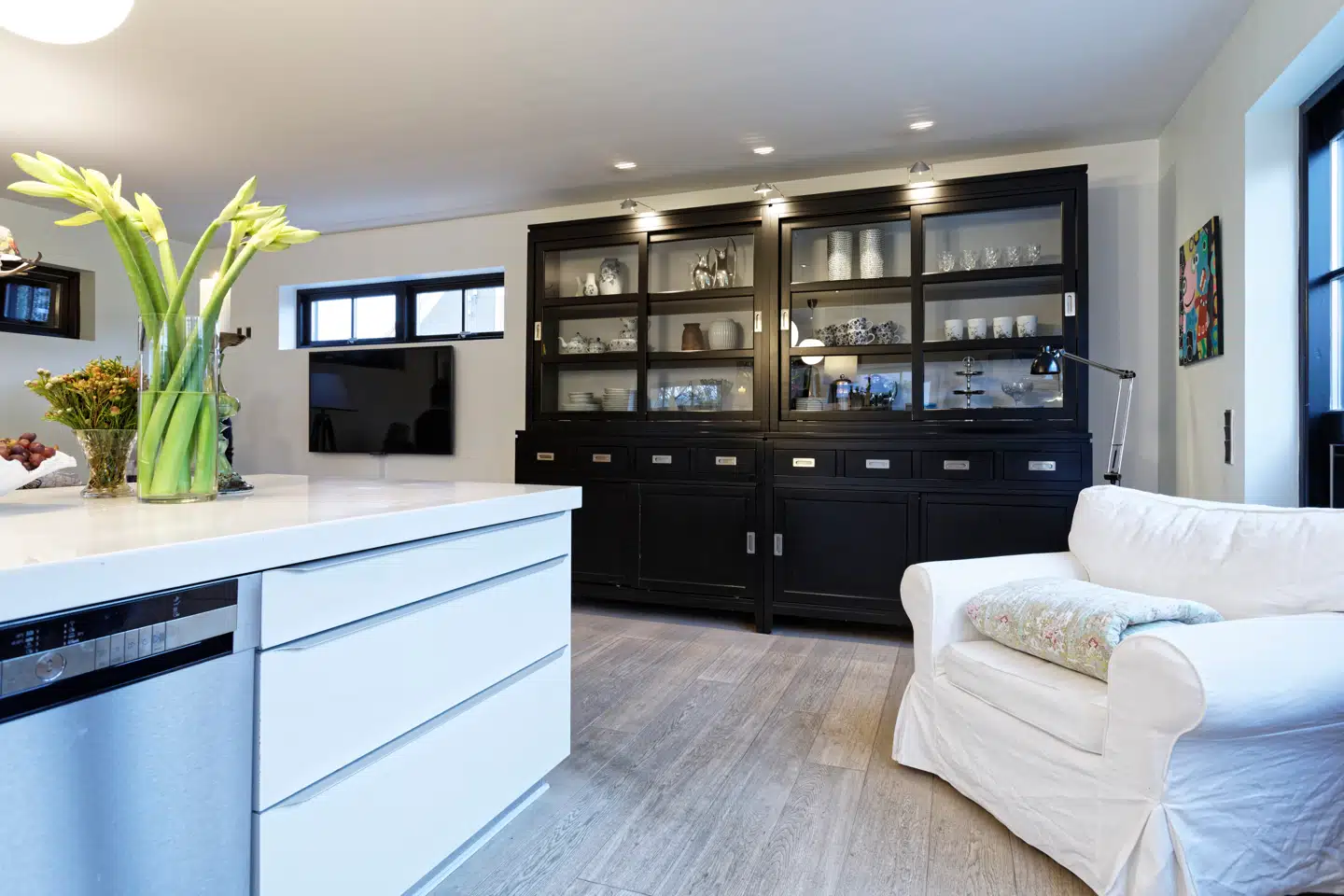 »Vi fandt hurtigt ud af, at tilbygningen med det nye køkken i skulle have et moderne udtryk og stå i kontrast til det over 100 år gamle, hvidpudsede hus. Derfor valgte vi at beklæde det med sortmalet træ, sort dør og sorte vinduer ud mod haven. Det er min egen idé med den 4,5 meter lange køkkensektion med bordplade af corian midt i lokalet med alle køkkenfunktioner på nær køleskab. Overskabe og unødvendige køkkenmaskiner vil jeg gerne være foruden. I stedet er her et stort, sort vitrineskab langs den ene væg til porcelæn og glas. Til de køkkenting, vi bruger i det daglige, har jeg købt en aluminiumsreol til 179 kr. Samme slags reol har vi i kælderen til fodtøj. Begge reoler giver et mere råt og mindre fornemt udtryk. Og så er der de gamle møbler, som, kombineret med nyt, giver en særlig hygge og hjemlighed.«