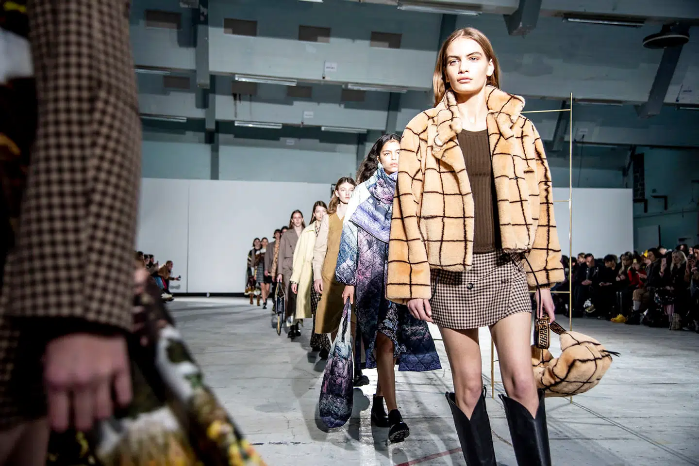 Men midt i falbeladerne står kundernes nødvendige spørgsmål tilbage. Hvordan oversættes vildskabens til hverdagens formsprog? Ved lidt hård sortering. For en lysegrøn kjole med smocksyet bærestykke, en natsort slå-om-sag med kridhvidt stjernedrys og et guldbestøvet jakkesæt i årets pantone-farve koral, var alle brugbare bud på morgendagens favoritter.