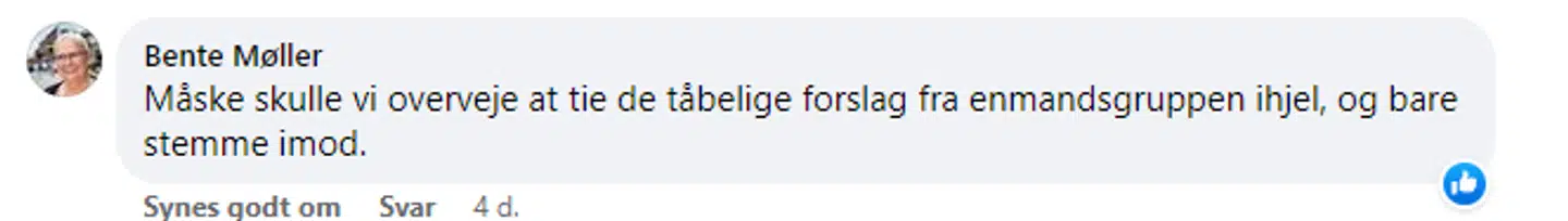 »Måske skulle vi overveje at tie de tåbelige forslag fra enmandsgruppen ihjel og bare stemme imod,« skrev Bente Møller i en Facebook-kommentar, hun sidenhen i Berlingske har undskyldt for.