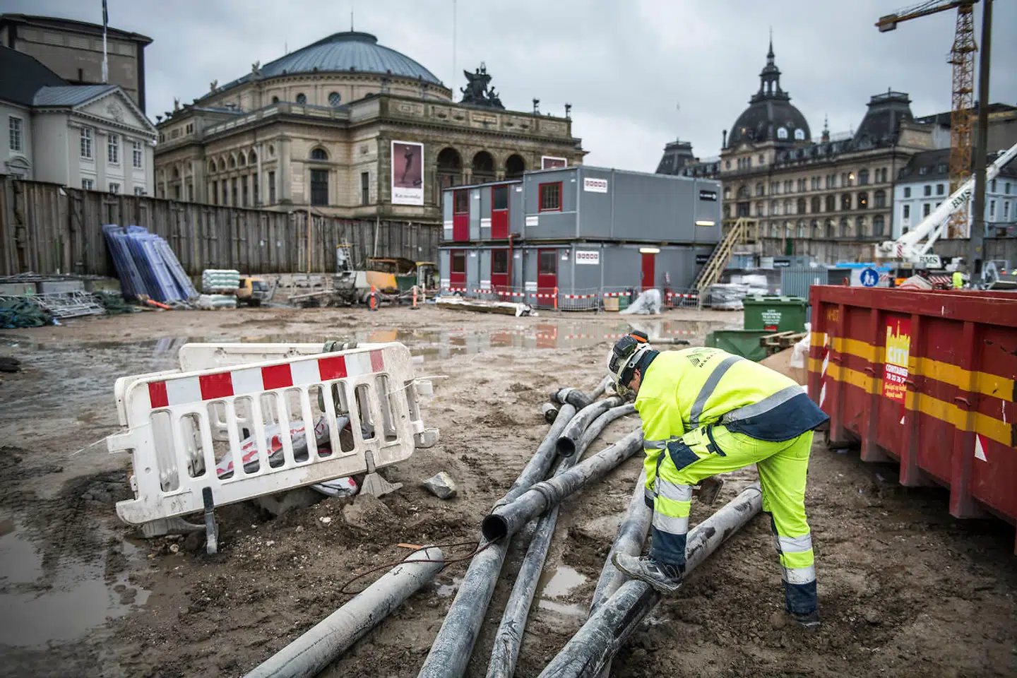 Tre rumænske herrer i regntøj fra top til tå ruller ned under jorden. Den ene er iført en kasket med logoet CMT – Copenhagen Metro Team – påtrykt i nakken.