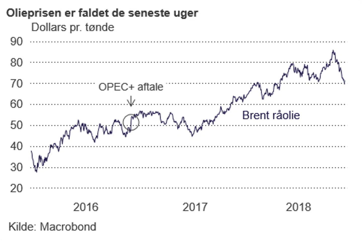 Oliepriserne har de seneste uger oplevet det største fald siden 2014, og prisen på en tønde nordsøolie er nu på 72 dollar, hvilket også var niveauet i midten af august. For bare en måned siden var diskussionen, om olieprisen ville fortsætte op mod 100 dollar pr. tønde.