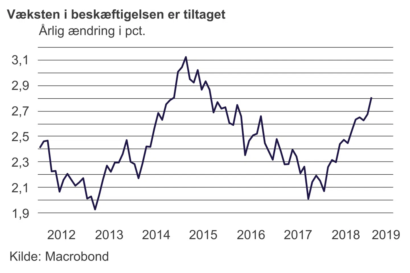 Efter den amerikanske centralbanks panikvending i pengepolitikken onsdag i sidste uge, var der ekstra fokus på fredagens jobrapport fra januar. Ville jobmarkedet bekræfte den svaghed, som har gennemsyret en række tillidsbarometre? Svaret er entydigt nej. Der blev skabt over 300.000 nye job i USA i januar, hvilket er det højeste i elleve måneder. Væksten i beskæftigelsen er tiltaget i løbet af det seneste år og er nu oppe på 1,9 pct. Det er ganske imponerende så langt henne i en konjunkturcyklus. Husholdningernes vurdering af arbejdsmarkedet er også blevet stadig mere positiv, hvilket har trukket flere ind på arbejdsmarkedet og dermed udskudt diskussionen om overophedning.