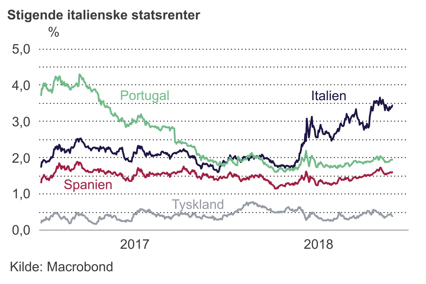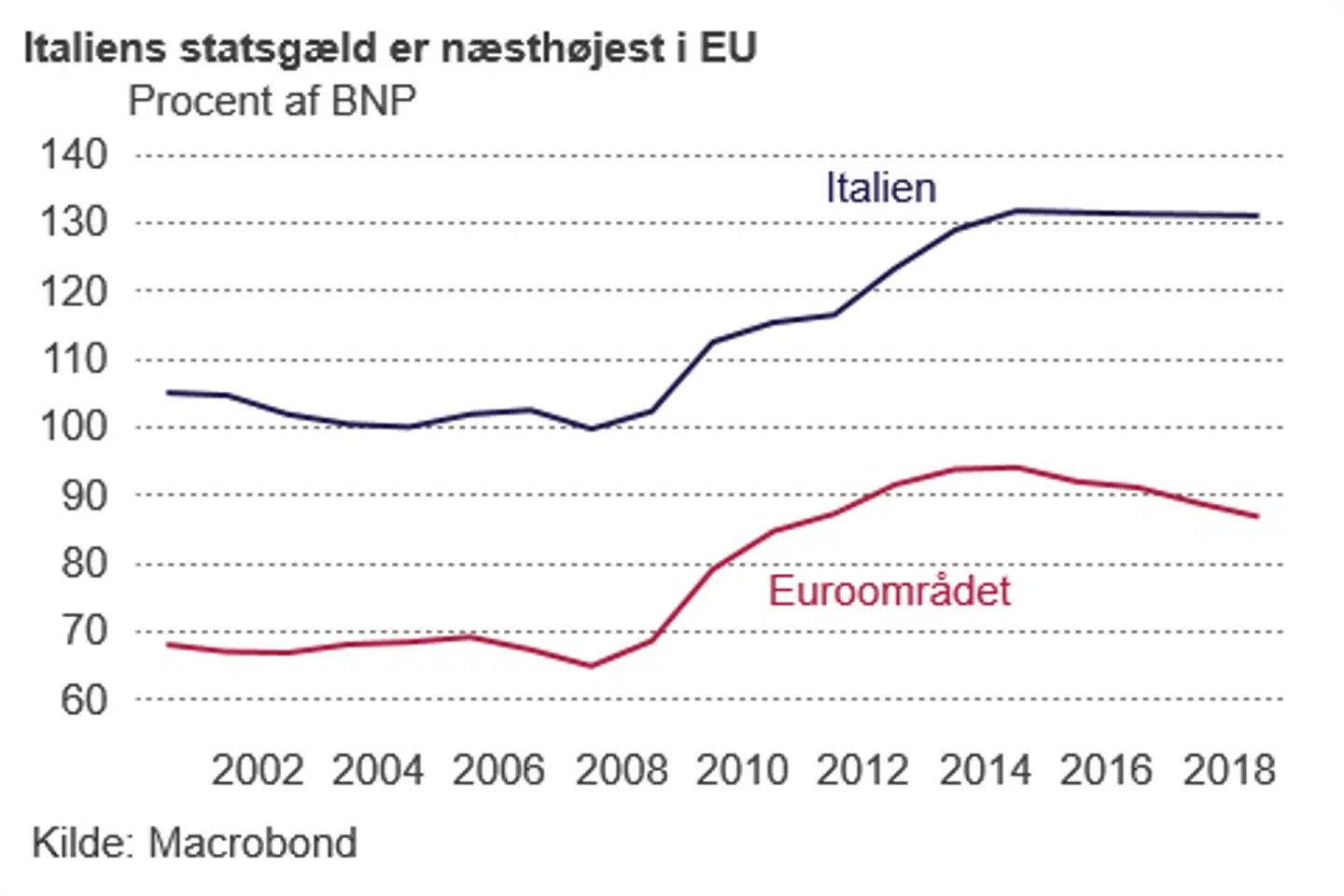 Der vil blive holdt godt øje med italienske nøgletal i de kommende måneder – og alle tegn på svaghed vil blive brugt mod den italienske regering. De italienske statsrenter er steget yderligere, og den tiårige rente ligger nu på 3,54 pct. i forhold til 0,39 pct. i Tyskland og 0,34 pct. i Danmark. Det giver stigende renteudgifter, som igen er med til at forværre budgetudsigterne – og italienske bankaktier er faldet kraftigt, siden regeringen præsenterede sit program i maj. Det er ikke uden grund, at politikere fra regeringspartierne forsøger at få Den Europæiske Centralbank til at fortsætte med at købe italienske statsobligationer. Meget mere larm venter i 2019.