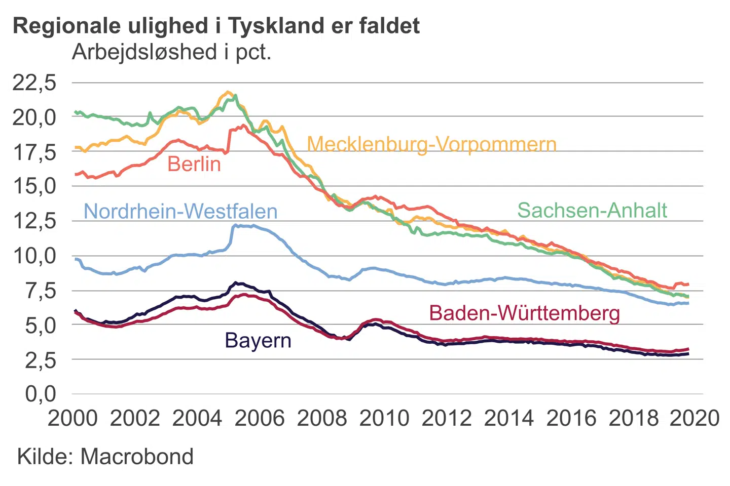 Det er ikke, fordi Vesttyskland sad med armene over kors. Hundredvis af milliarder af D-mark og euro er blevet postet i de østlige delstater. Først nu er ledigheden for alvor nedbragt, men der er fortsat stor forskel i indkomstniveauerne mellem Øst og Vest – og udvandringen til de store byer accelerer følelsen af at være sakket bagud. Akkurat som den gør det i det nordlige England og i Picardiet i det nordlige Frankrig.